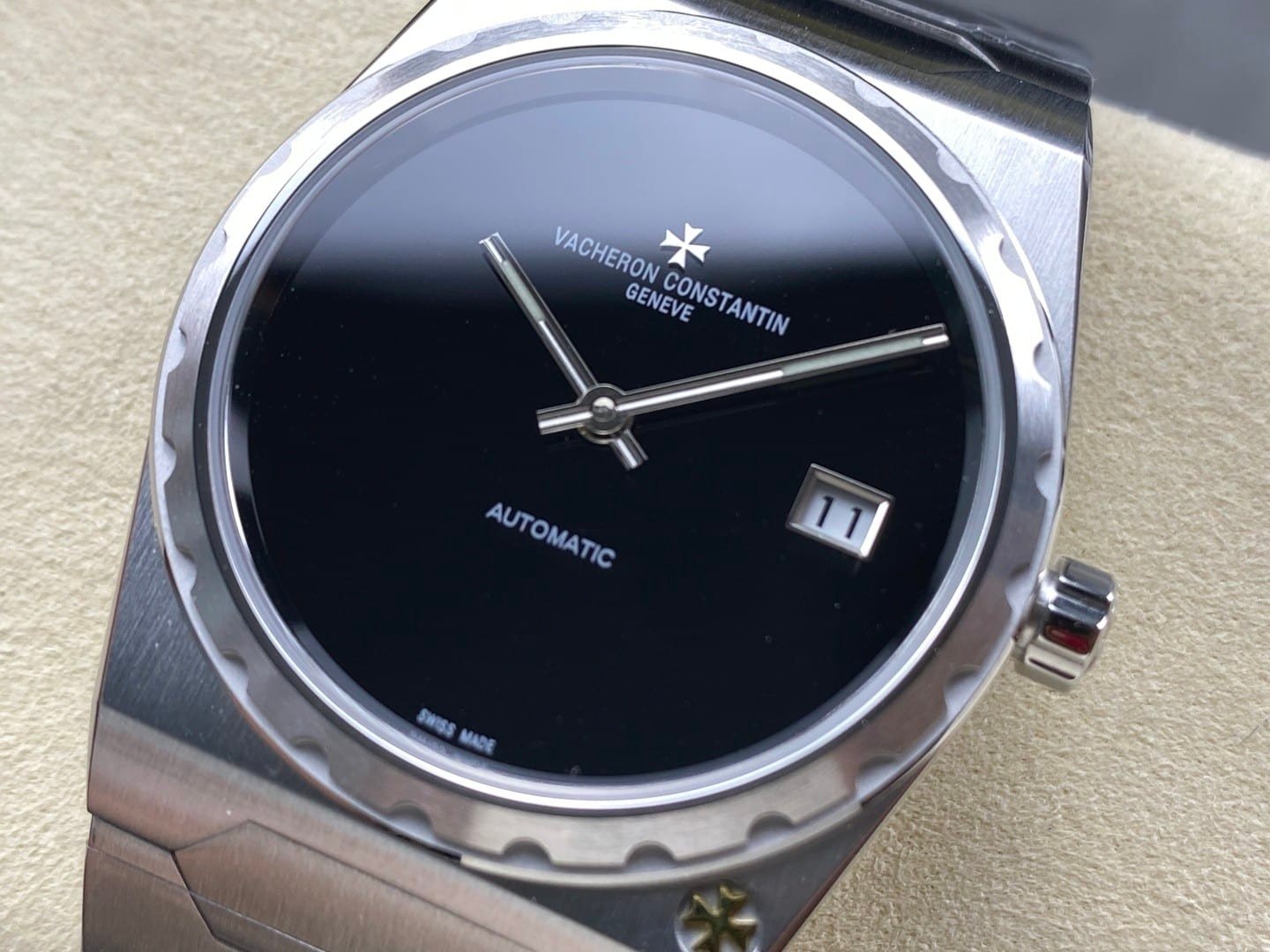 The case architecture negotiates the wrist rather than accommodating it. The notched bezel breaks reflections into short flashes, while the mid-case remains brushed and quiet. There is little curvature designed to soften contact automatically. Instead, the watch expects the wrist to adapt. Traditional lug articulation does not exist, so movement causes the entire watch to shift as one object. Compared with modern Vacheron Constantin lines, this case does not melt into the wrist. It holds position. Subtle traces of guangzhou watchmaking appear in the edge finishing, where transitions are slightly softened to avoid sharpness without erasing definition.