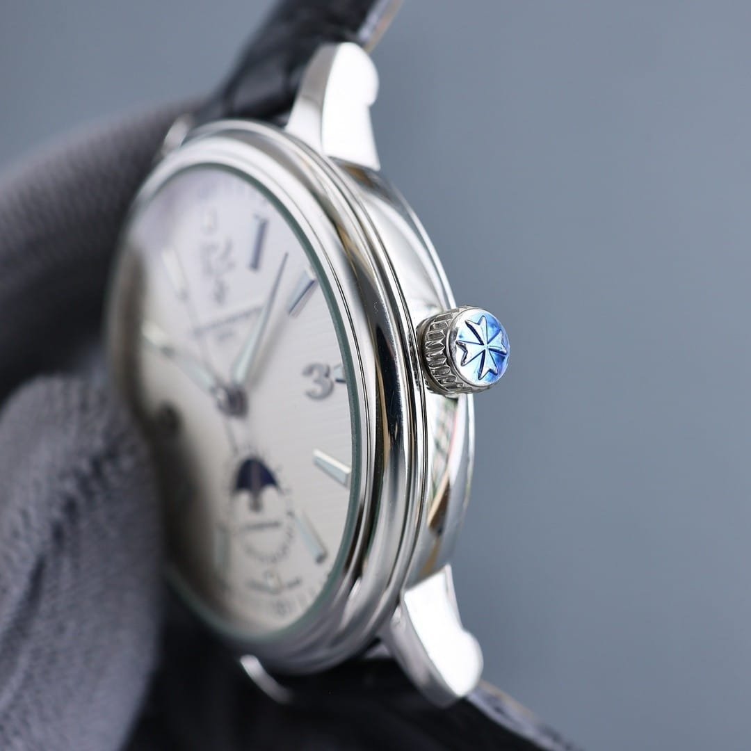 The case architecture is traditional but not passive. The bezel is thin and polished, reflecting light sharply, while the mid-case remains restrained. Lug length is moderate, but their downward angle is minimal, meaning the strap, rather than the case, absorbs most wrist curvature. Compared to modern Vacheron Constantin lines, this case negotiates with the wrist instead of accommodating it. The guangzhou watchmaking influence appears subtly in the polish consistency, where transitions are smooth but slightly less abrupt at the edges.