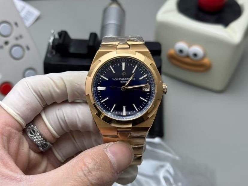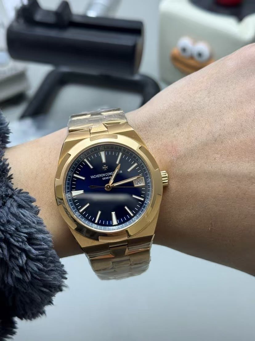 This is the 41mm blue-dial Overseas interpreted by QC factory, finished in a warm rose-gold tone with a fully integrated bracelet. The first moment the watch settles on the wrist, the warmth of the metal becomes noticeable—rose gold reaches skin temperature faster than steel, giving the watch a calmer initial feel. The deep blue dial sits quietly beneath the bezel, absorbing most early-morning light until the wrist begins to move.
