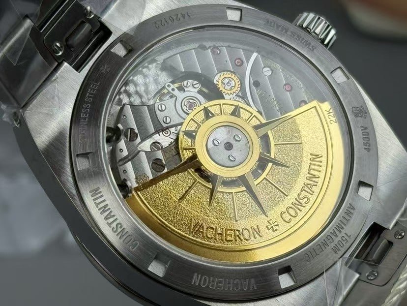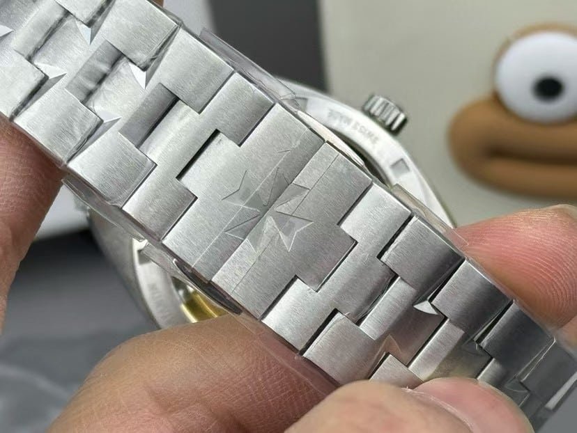 8F factory Overseas pieces typically prioritize case shape accuracy, bracelet integration, and dial depth over aggressive movement decoration. The brushing pattern is consistent, and the bezel polish transitions follow the original geometry well.