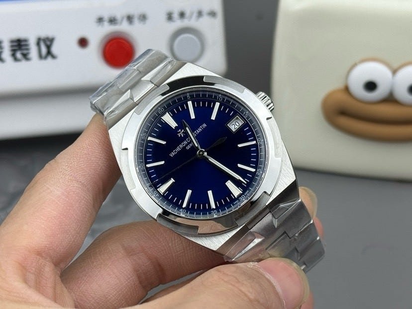 This is the 41mm blue-dial Overseas from 8F factory, built in stainless steel with the familiar integrated geometry that defines the modern series. The first moment it settles on the wrist, the weight spreads more evenly than expected for a sports case of this shape. The bezel shifts light in sharp, directional bands, while the dial stays surprisingly calm beneath it.