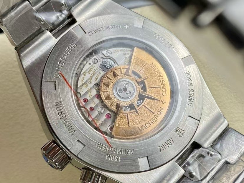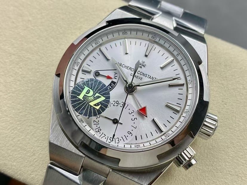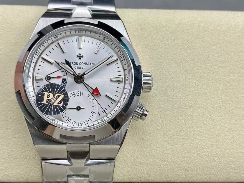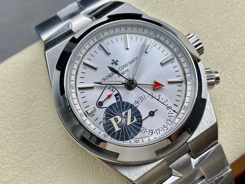 Exact model: Vacheron Constantin Overseas Dual Time 7900V/110A-B333 in stainless steel, shown here in the clean sunburst-silver dial that always looks calmer in real life than in photos. At 41 mm, the case settles onto the wrist with a soft, architectural presence—more about proportion and clarity than the usual aggressiveness you see in sports watches. The Dual Time layout pulls your attention slowly rather than immediately: the AM/PM sector sits deep enough to cast a faint shadow, the pointer-date arc feels balanced instead of crowded, and the red-tipped GMT hand appears only when the light catches its edge.
