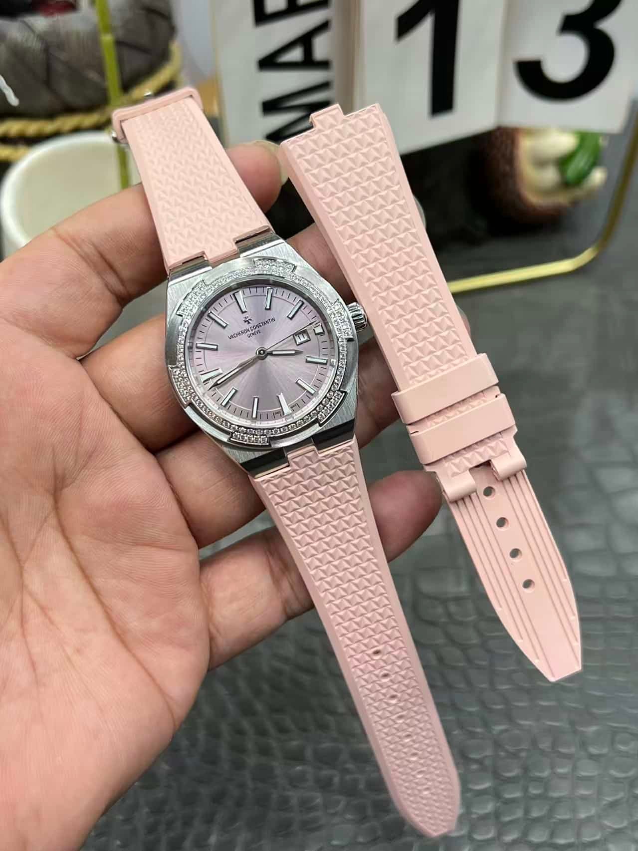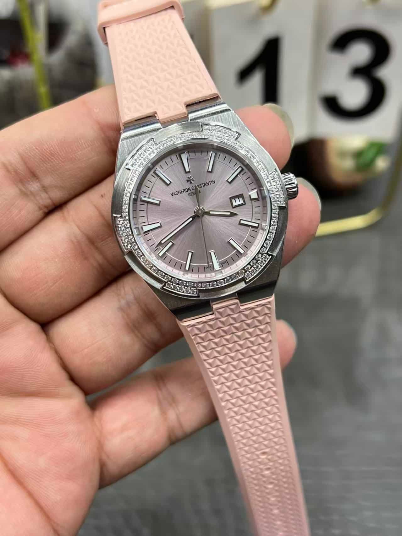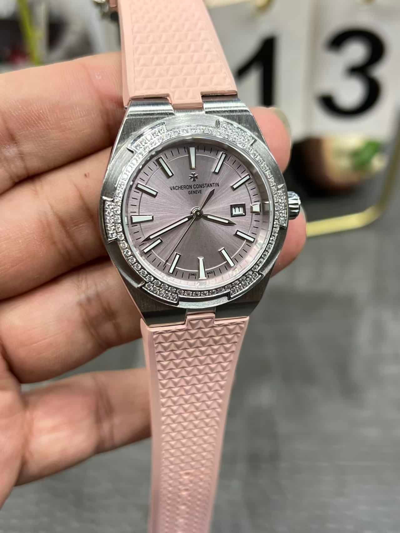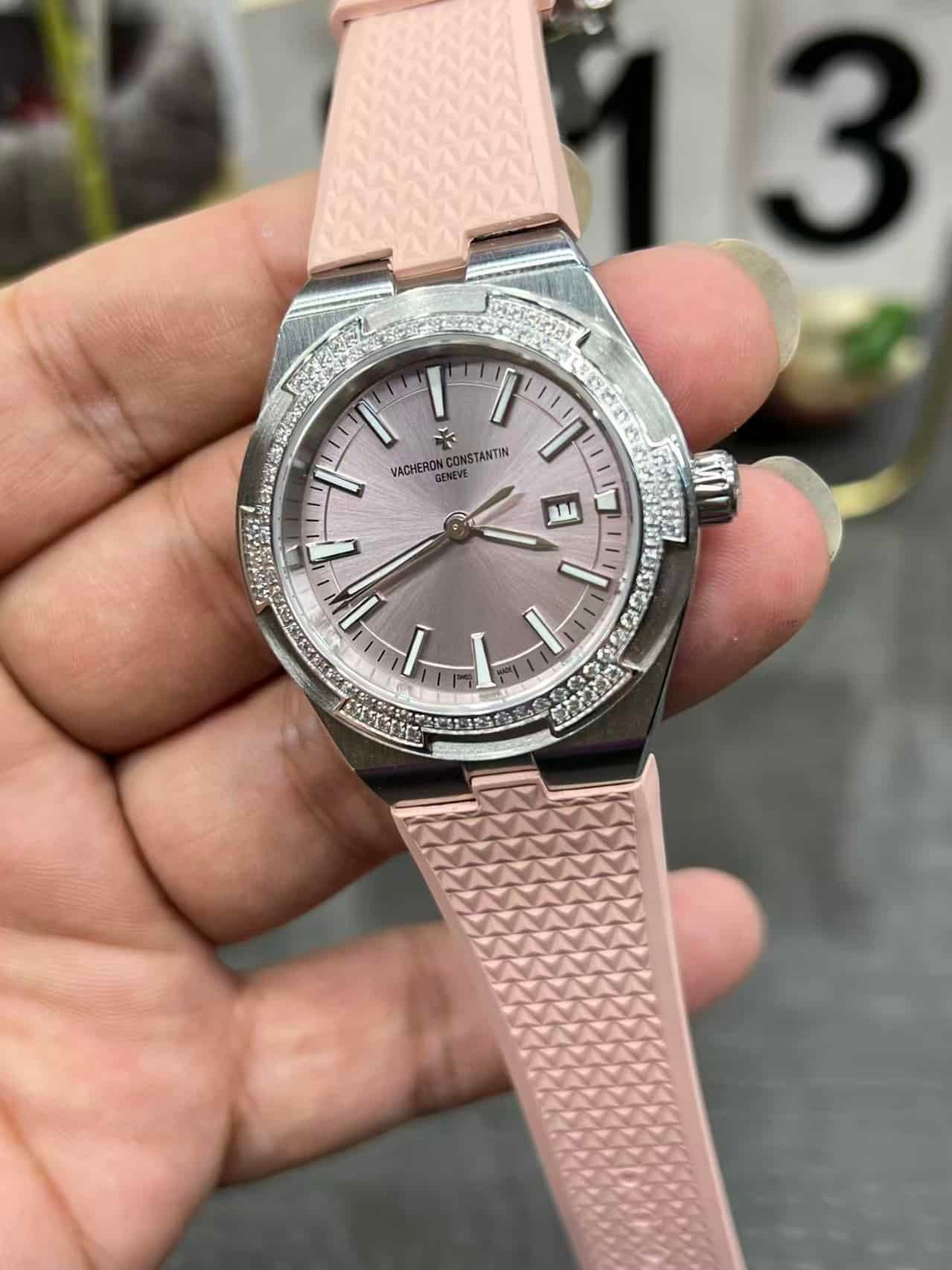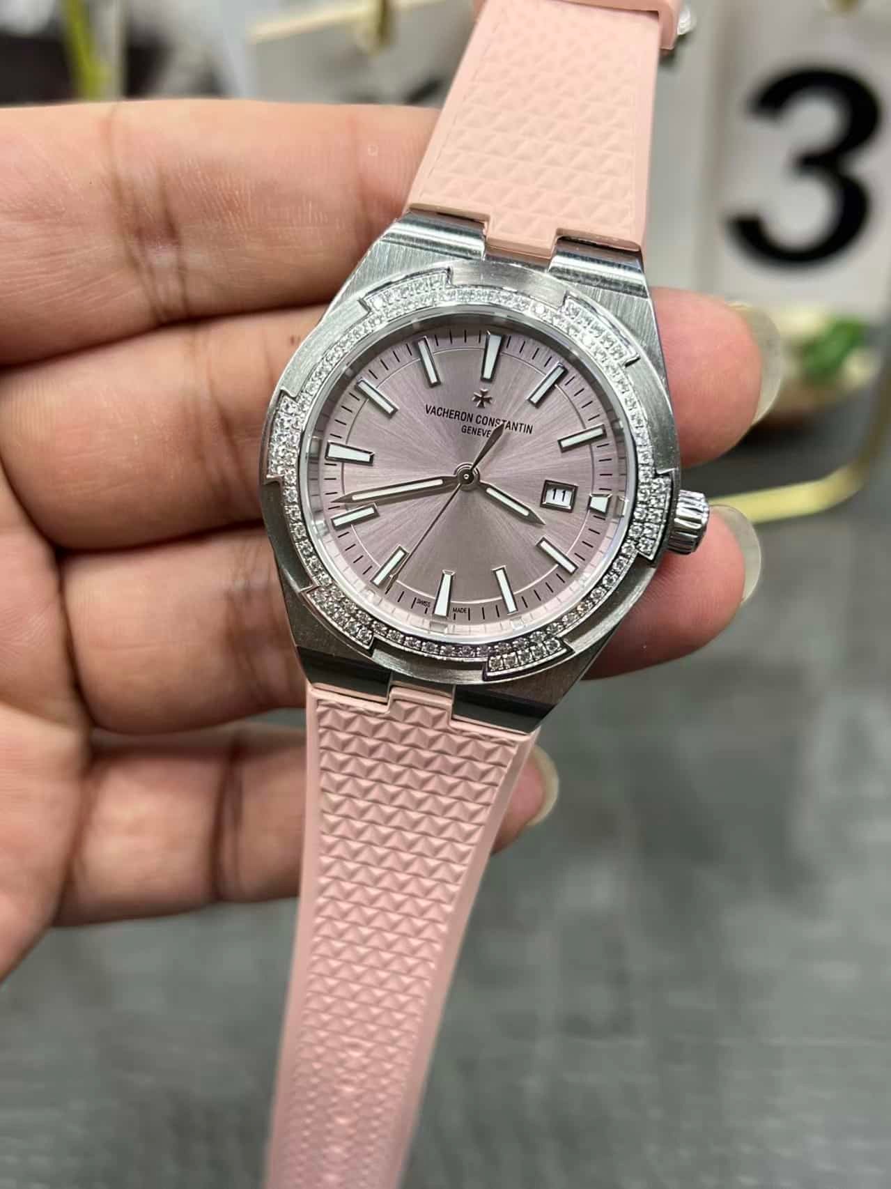 Super Clone Vacheron Constantin Overseas Lady 33mm Pink Dial Diamond Bezel Pink Rubber Strap BBS Factory