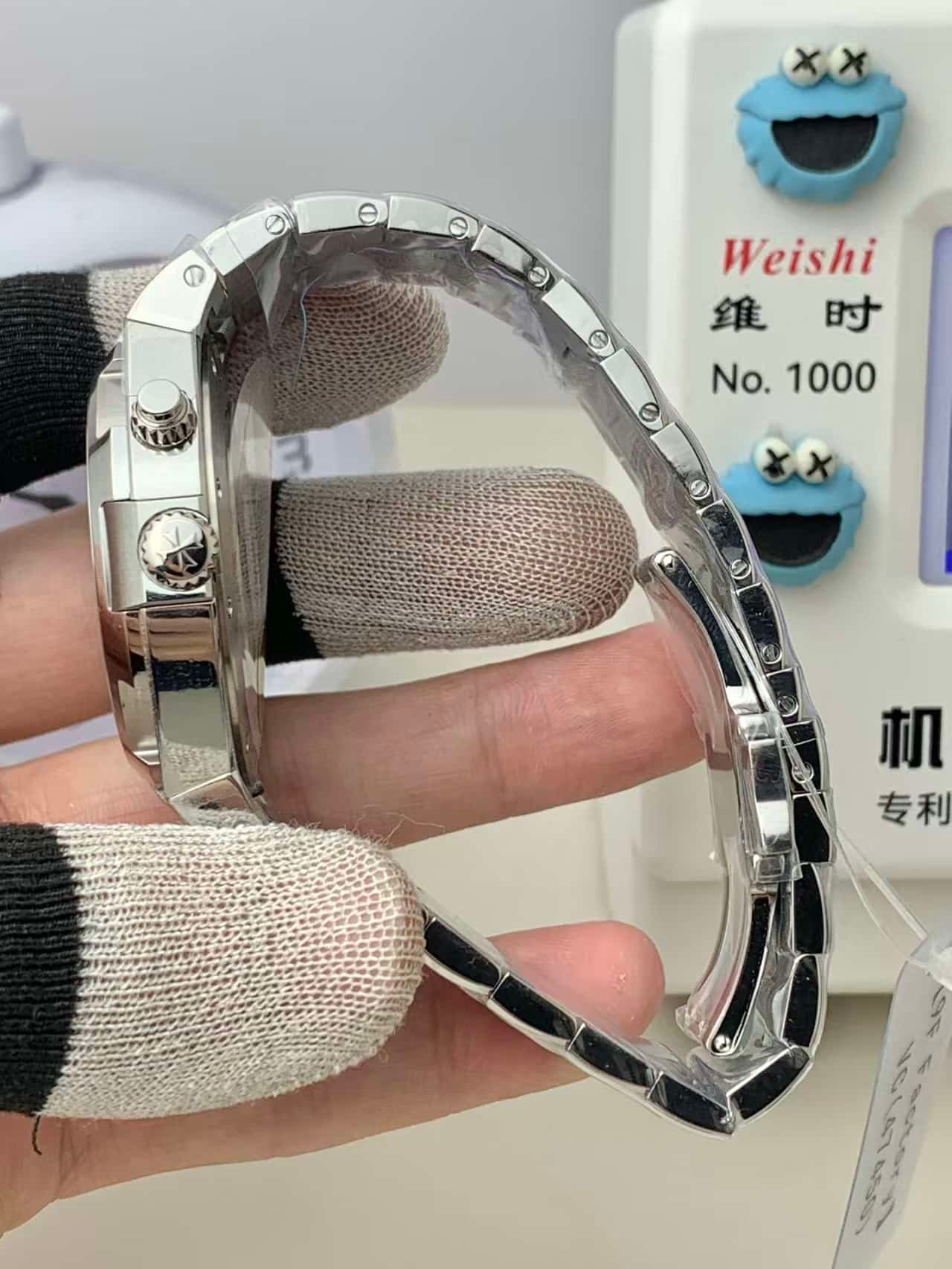 This Overseas replica carries natural experiential differences: the strap material is slightly firmer initially, diamond reflections are broader, rotor acoustics differ from the genuine ultra-thin movement, and the dial tone shifts slightly under LED lighting.