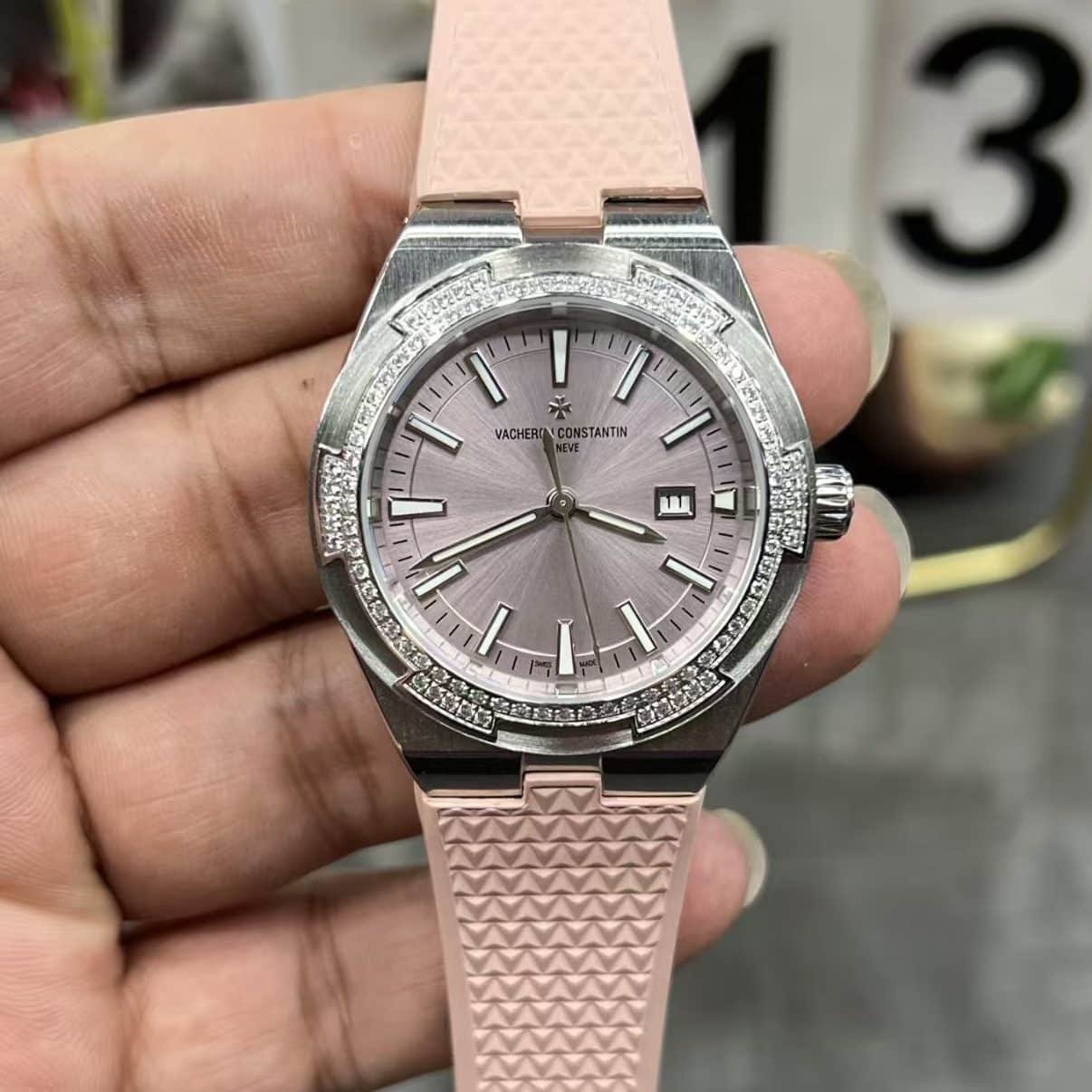 This is the 33mm Overseas Lady, interpreted by BBS factory, combining a sunburst pink dial, a diamond-set bezel, and a soft pink rubber strap that immediately shifts the watch into an everyday–luxury space. The first moment it settles on the wrist, the watch feels lighter and more intimate than the larger Overseas references. The smaller case distributes its weight evenly, and the rubber strap reduces the sense of metal contact, making the watch feel almost like an accessory until the dial catches light.