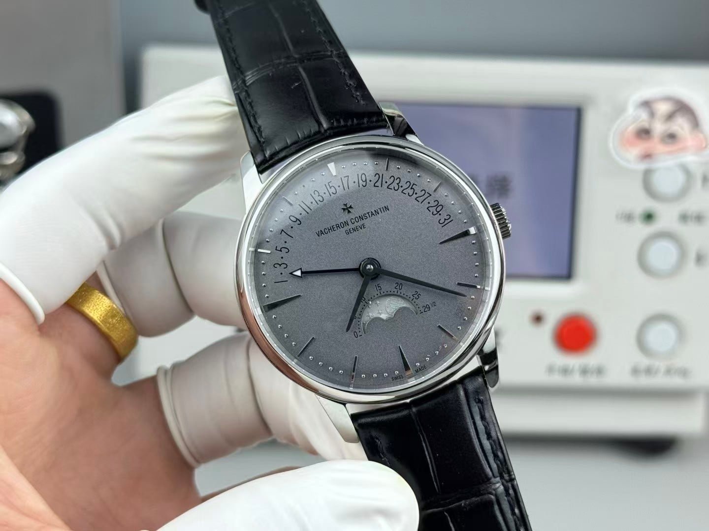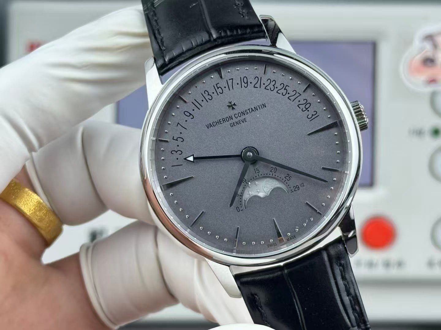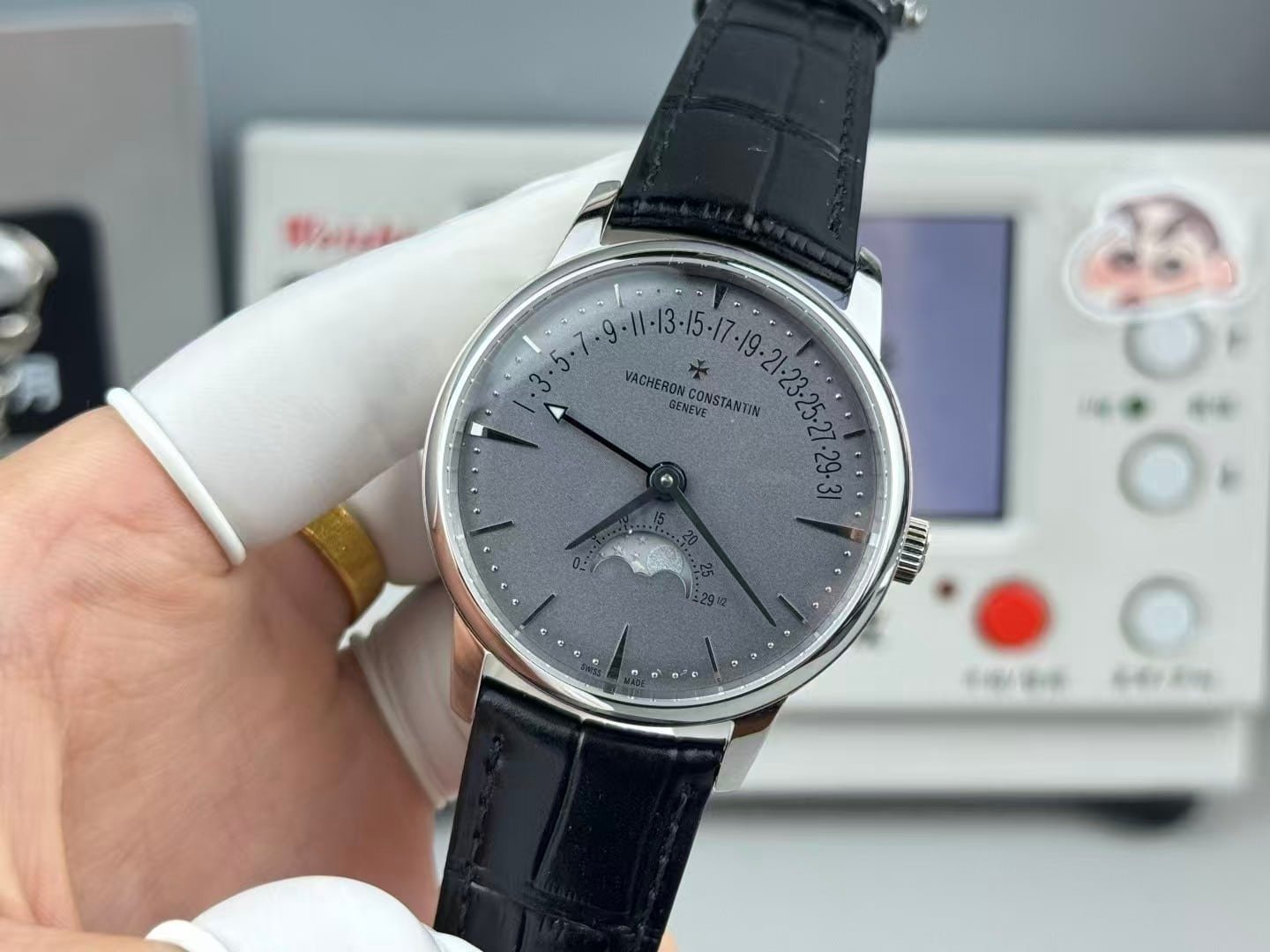The watch shown is clearly a Vacheron Constantin Patrimony Moon Phase and Retrograde Date, identifiable by its arc-shaped retrograde date scale from 1–31, its moonphase aperture at 6 o’clock, and the overall 42.5mm Patrimony case geometry. The matte charcoal-gray dial and the long slender baton indexes confirm it belongs to the modern Patrimony generation. MKS factory interprets this reference with a 9015-based movement paired with a retrograde + moonphase module, maintaining the visual layout while preserving the thin, elegant case silhouette typical of the 4010U family.