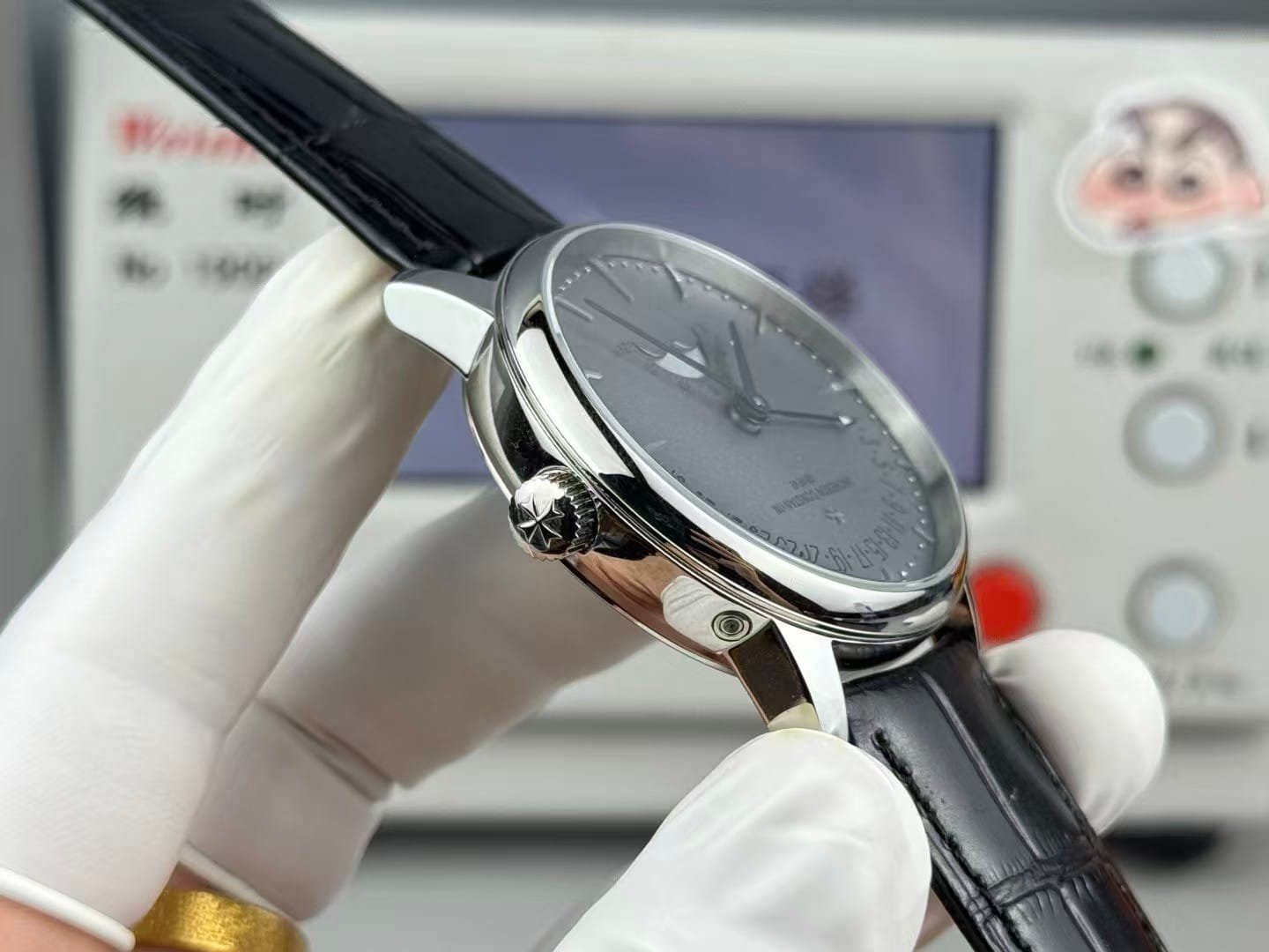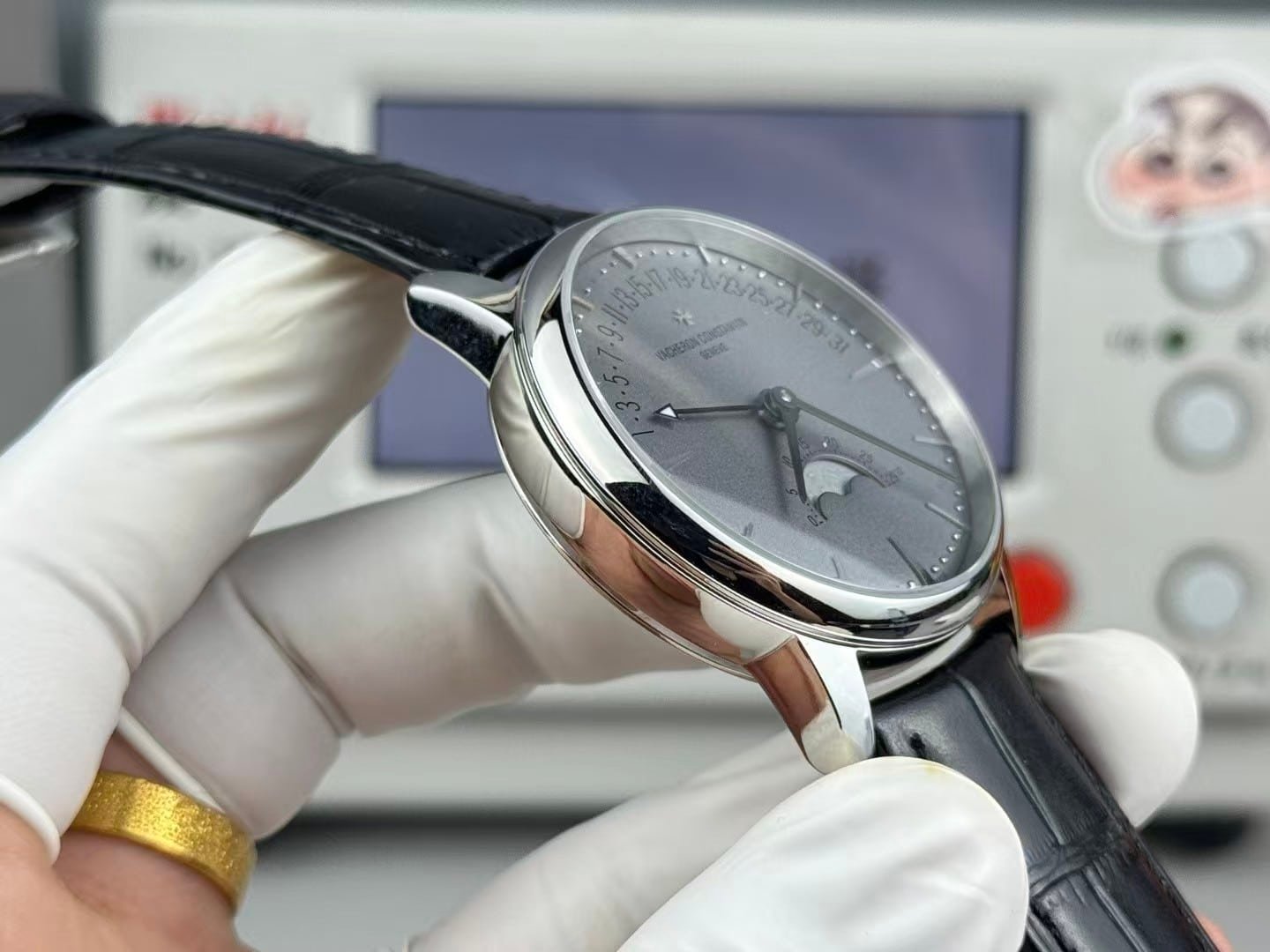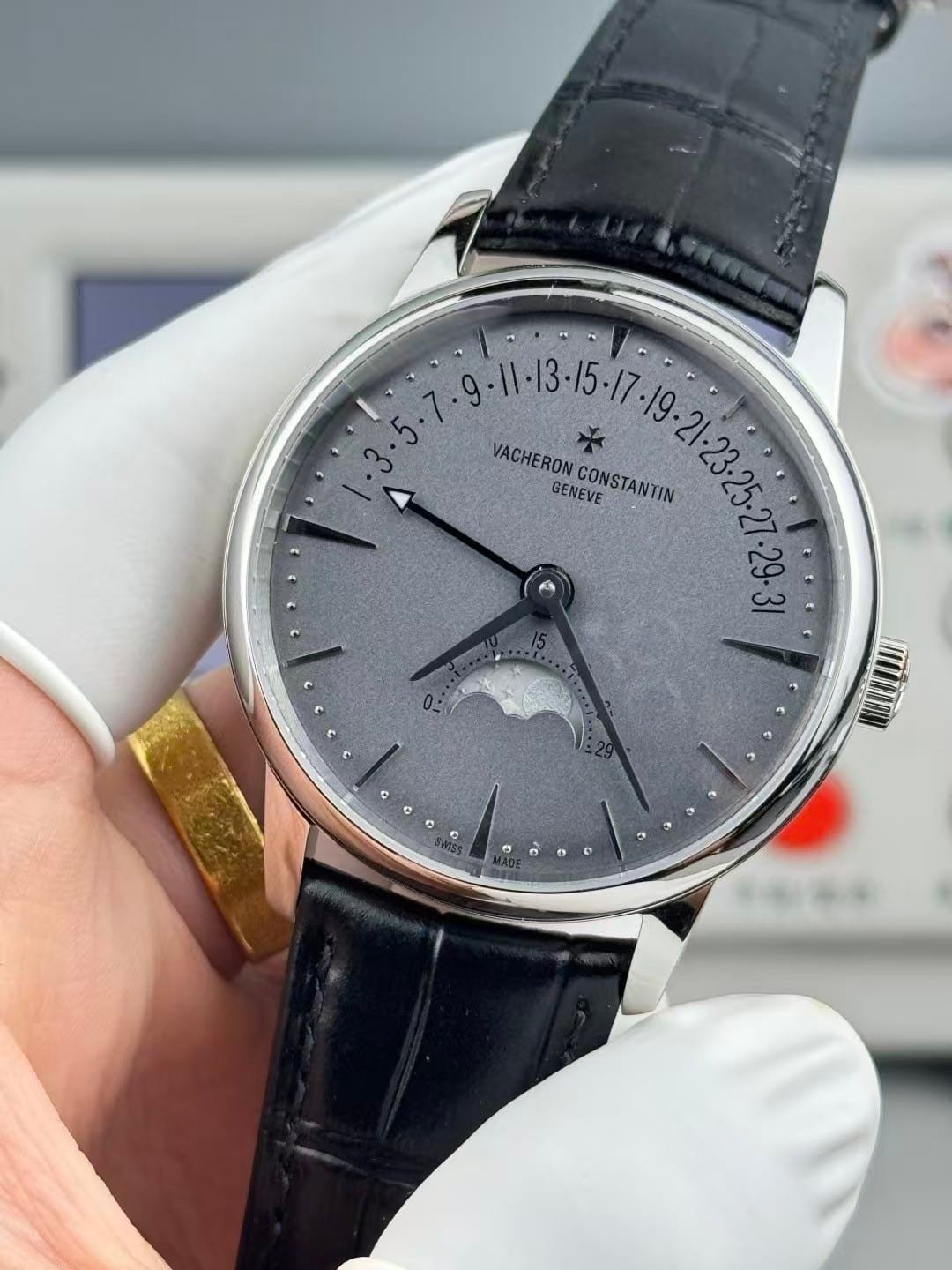 The watch shown is clearly a Vacheron Constantin Patrimony Moon Phase and Retrograde Date, identifiable by its arc-shaped retrograde date scale from 1–31, its moonphase aperture at 6 o’clock, and the overall 42.5mm Patrimony case geometry. The matte charcoal-gray dial and the long slender baton indexes confirm it belongs to the modern Patrimony generation. MKS factory interprets this reference with a 9015-based movement paired with a retrograde + moonphase module, maintaining the visual layout while preserving the thin, elegant case silhouette typical of the 4010U family.