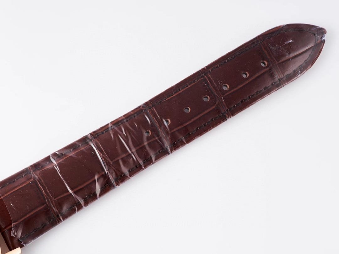 The brown leather strap arrives firm, typical of Guangzhou replica workshop output. Initially, it resists bending near the lugs, but within a week of wear it begins to soften and conform to the wrist. The leather retains heat moderately and releases moisture efficiently, making it comfortable under cuffs during long days.