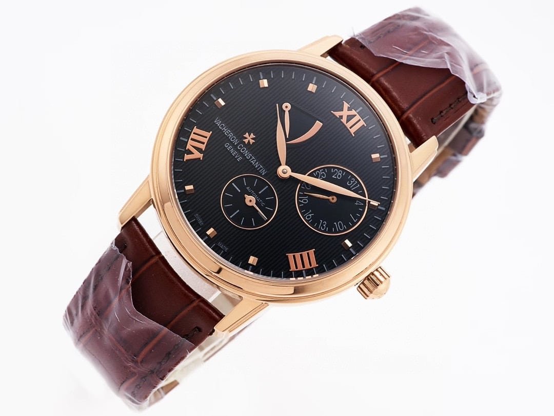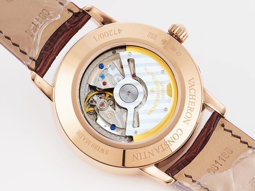 The watch presented here corresponds visually and proportionally to the Vacheron Constantin Traditionnelle reference 47200/000G-9019, a multi-function configuration expressed through a 41mm case rendered in warm rose-gold tone and paired with a dark, vertically textured dial. The strap is brown leather, fitted with a Maltese cross pin buckle, and the overall stance is unmistakably Traditionnelle rather than Patrimony. On first wear, the sensation is one of balanced density. The case carries enough mass to feel intentional, yet it settles quickly against the wrist without rolling or drifting, helped by lugs that descend with restraint rather than flourish.