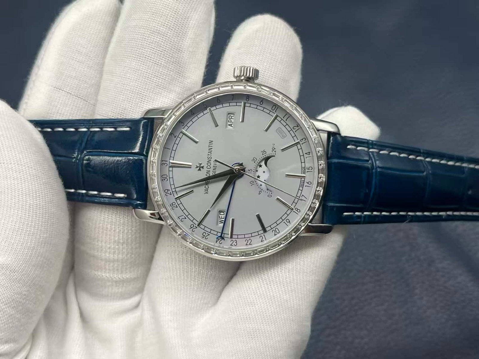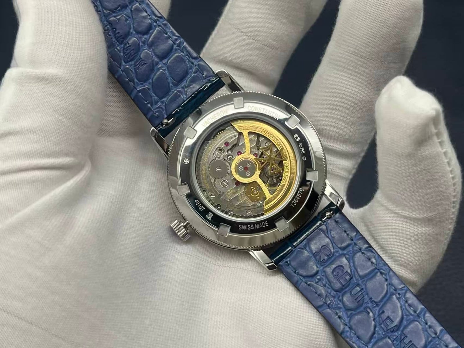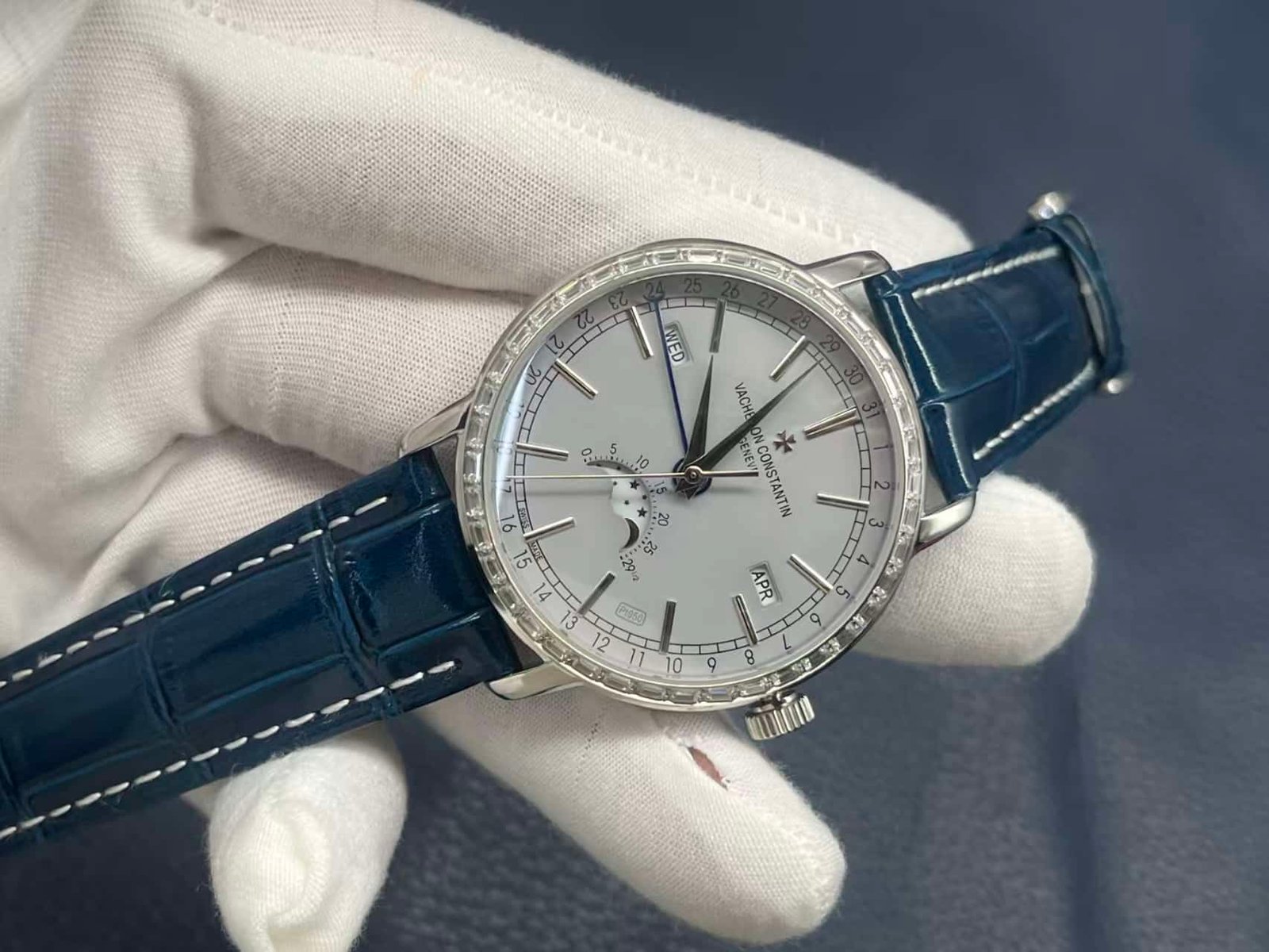 Winding feels smooth, without the abrupt mechanical jumps or resistance variations often found in non-Vacheron-based clones. The watch carries a clean central seconds behavior, stable date-index positioning, and consistent calendar engagement when transitioning near midnight.