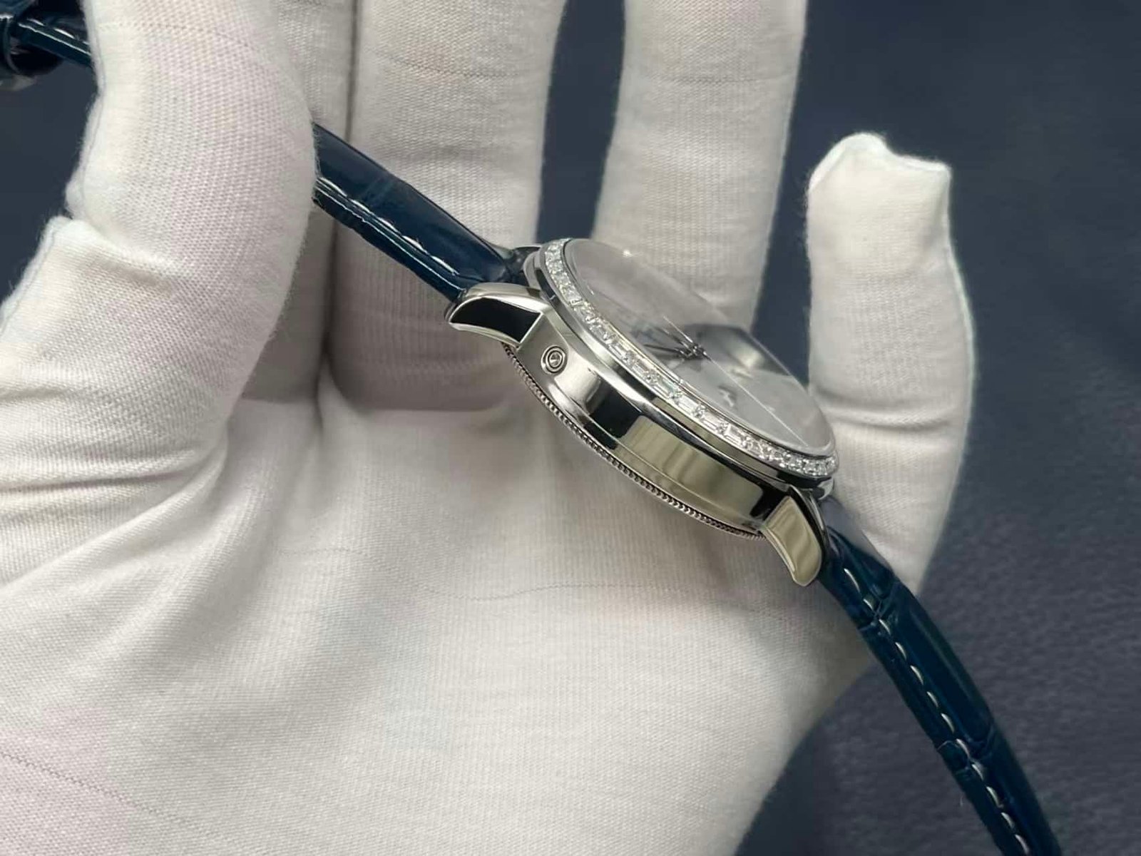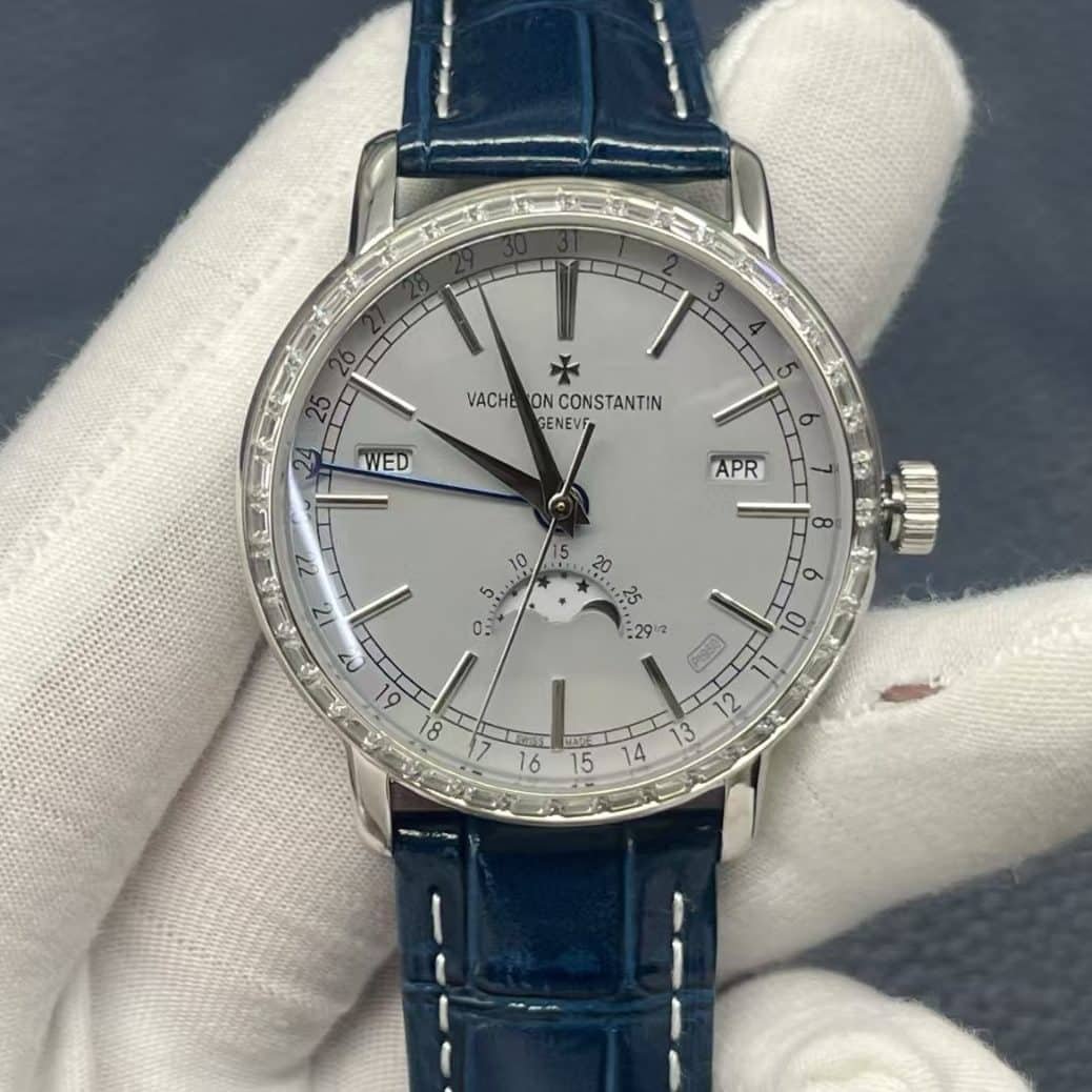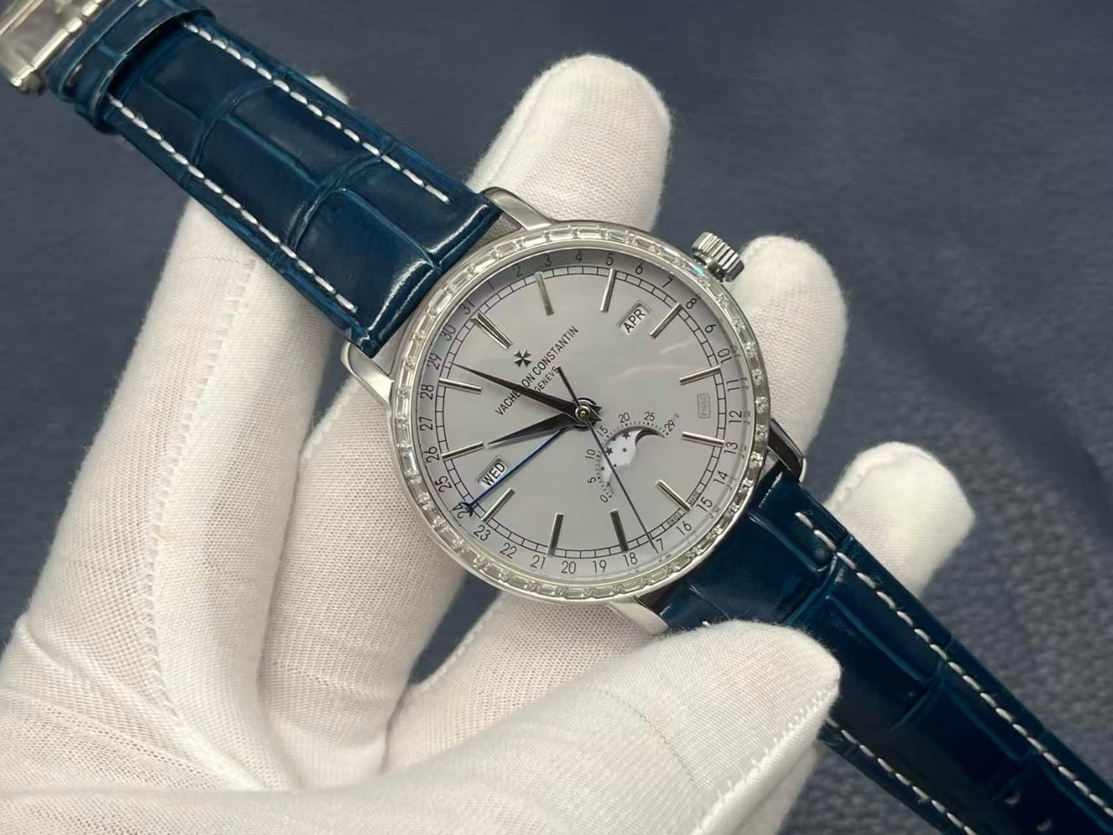Winding feels smooth, without the abrupt mechanical jumps or resistance variations often found in non-Vacheron-based clones. The watch carries a clean central seconds behavior, stable date-index positioning, and consistent calendar engagement when transitioning near midnight.