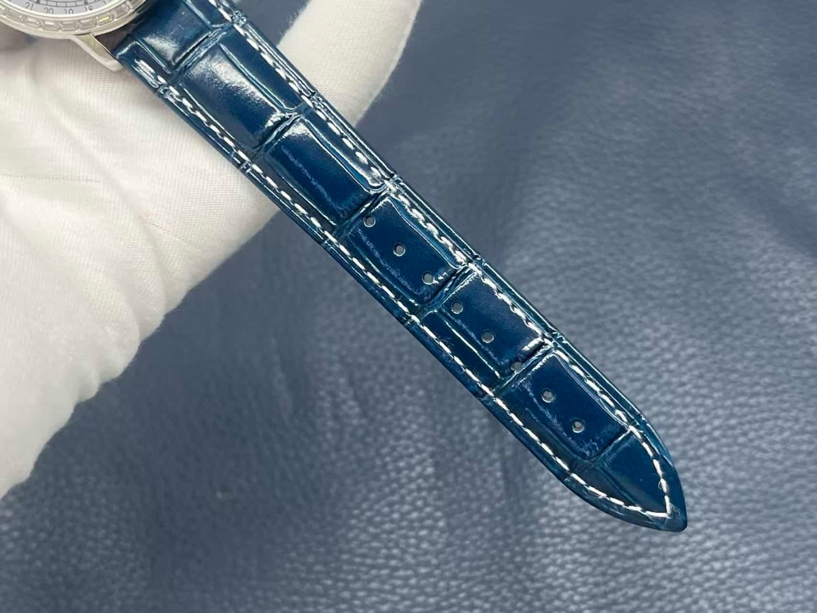 With darker leather, the look becomes archival and traditional. With blue alligator (as shown), the watch gains a subtle modernity without losing formality. The calendar display always remains the emotional center of the piece: calm—never urgent, never busy.