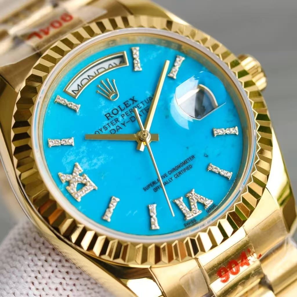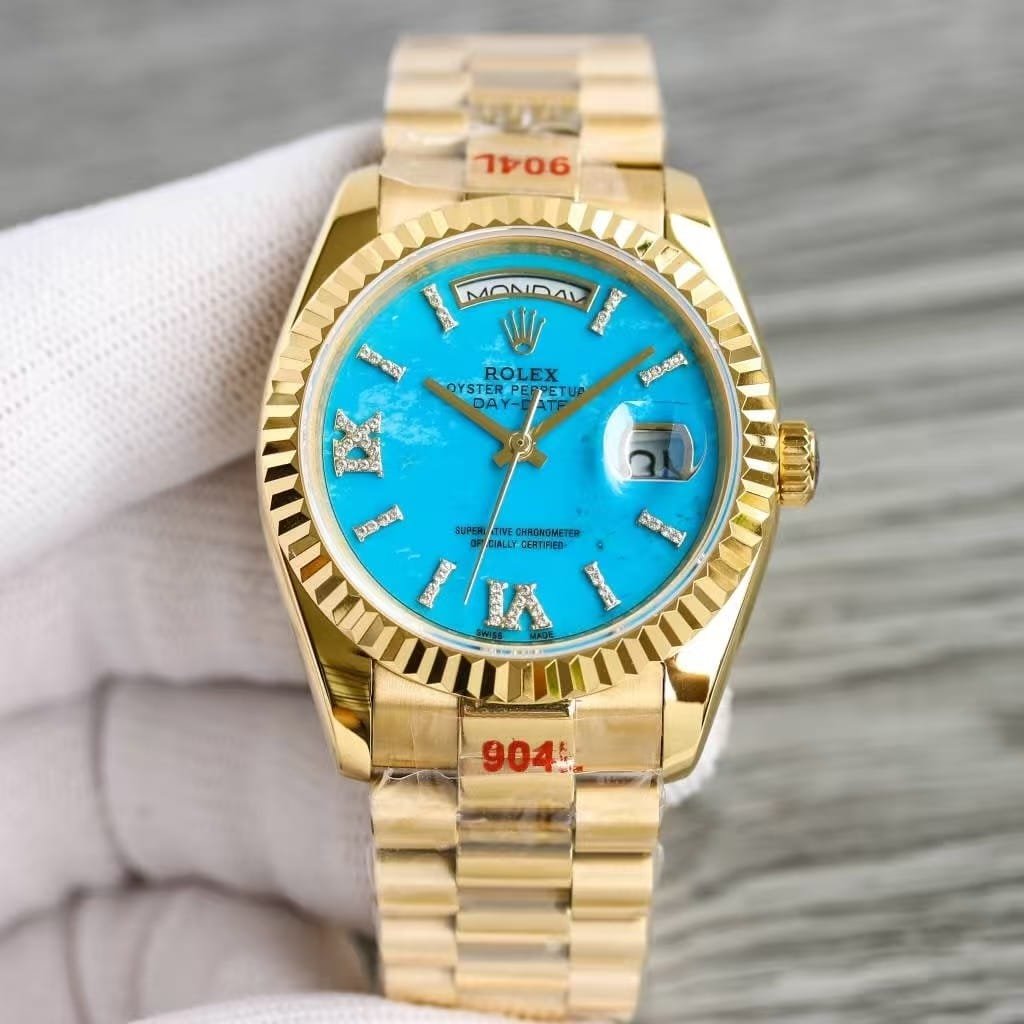 The Rolex Day-Date 40 Turquoise Dial stands out as a work of art — elegant, daring, and instantly recognizable. Its bright turquoise dial captures light like a gemstone, framed by a diamond-set bezel that enhances its luminous depth.