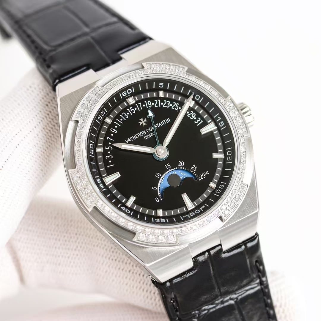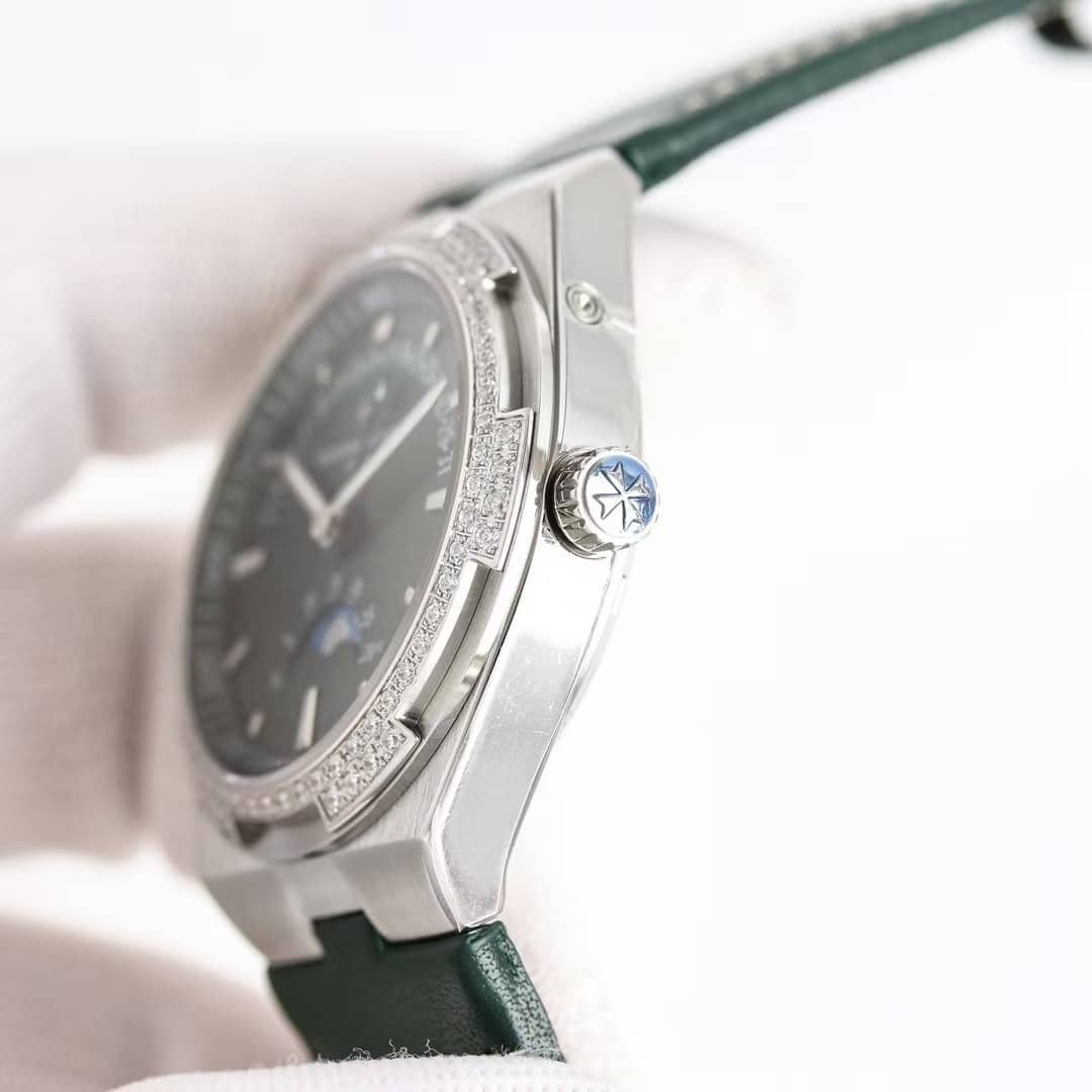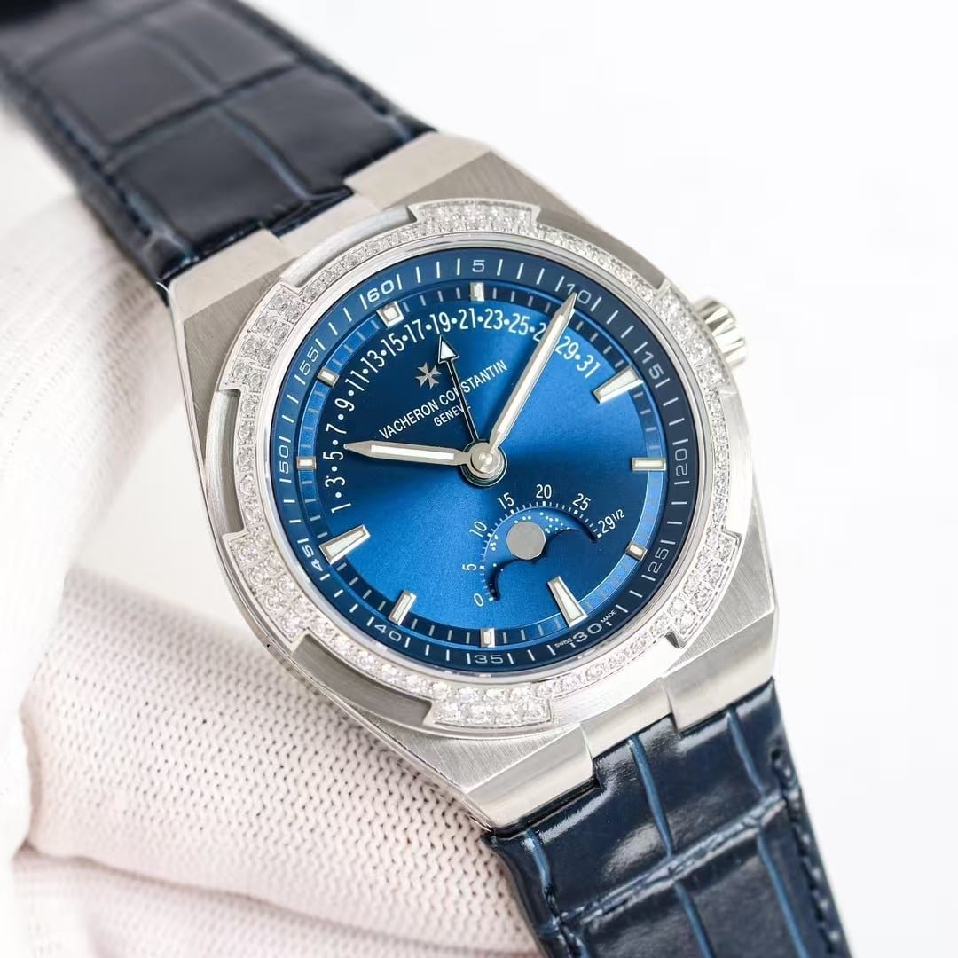 This Overseas moonphase with retrograde date is one of those pieces that feels different the moment it touches the wrist. Even before you focus on the complications, the first impression is always the case profile: slim enough to slide under a cuff, yet tall enough to carry the geometry that has defined the Overseas family for years. The diamond-set bezel is cut cleanly with sharp separation between facets, so each color dial — silver, blue, black, green — reacts to light in its own rhythm. Silver appears almost weightless under daylight, blue deepens into a saturated navy tone indoors, black carries a dressier seriousness, and green shows that subtle metallic shimmer only sunburst plates can deliver. Guangzhou high-end workshops have learned how to finish these surfaces without the milky haze common in older replica watch China productions, which is why the transitions from brushed to polished areas feel crisp rather than blended.