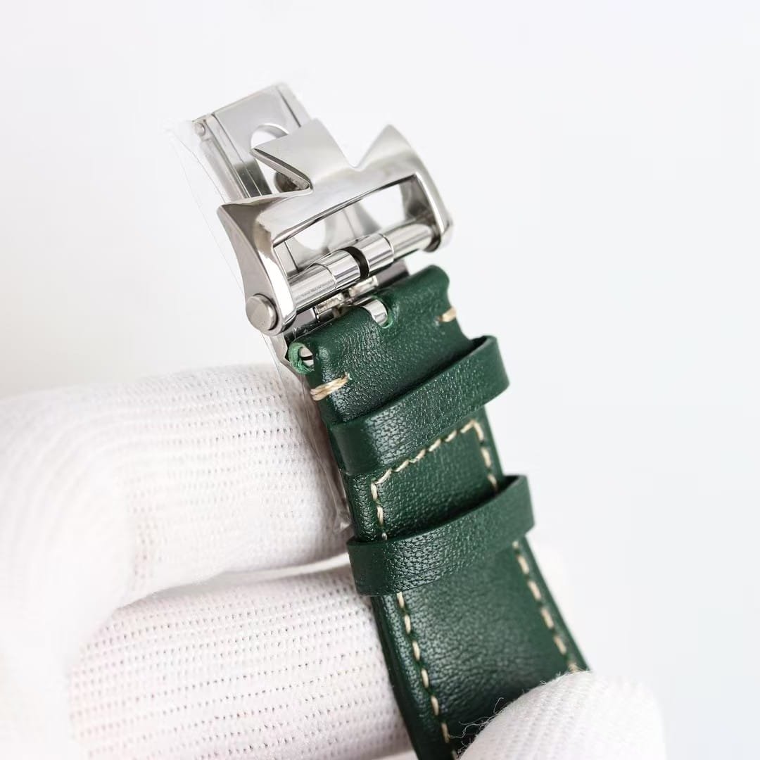 Both the rose-gold tone cases and steel versions share the same geometry — the signature notched bezel, straight-cut lugs, and a mid-case that transitions with clean brushing. The finishing is one of the biggest improvements in this generation of Guangzhou super clones: brushing is tight and directional, and polished edges do not bleed into adjacent surfaces. The watch sits securely thanks to a balanced caseback and a leather strap that is noticeably stiffer at first wear but softens within a few days. Color-matched straps — brown, blue, black, and green — allow each dial to present a different personality: dressy in black, warm and classic in brown, contemporary in blue, and unexpectedly subtle in green.