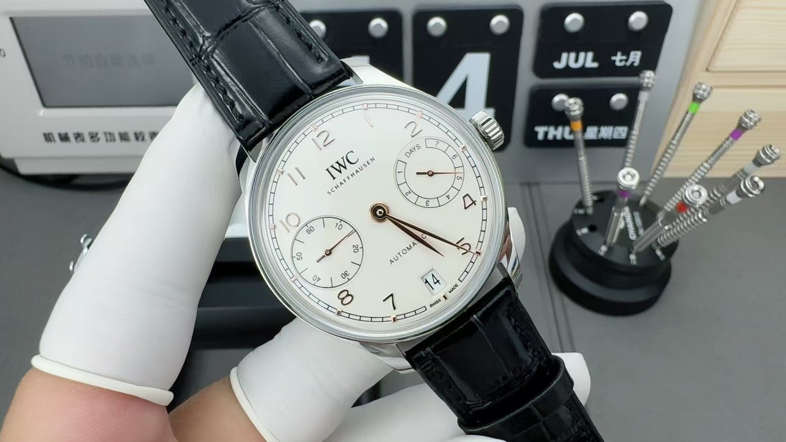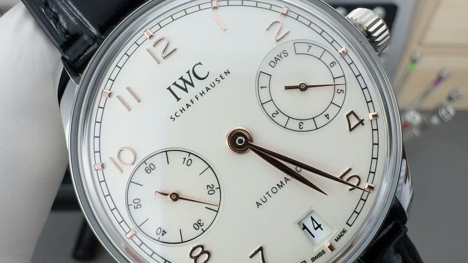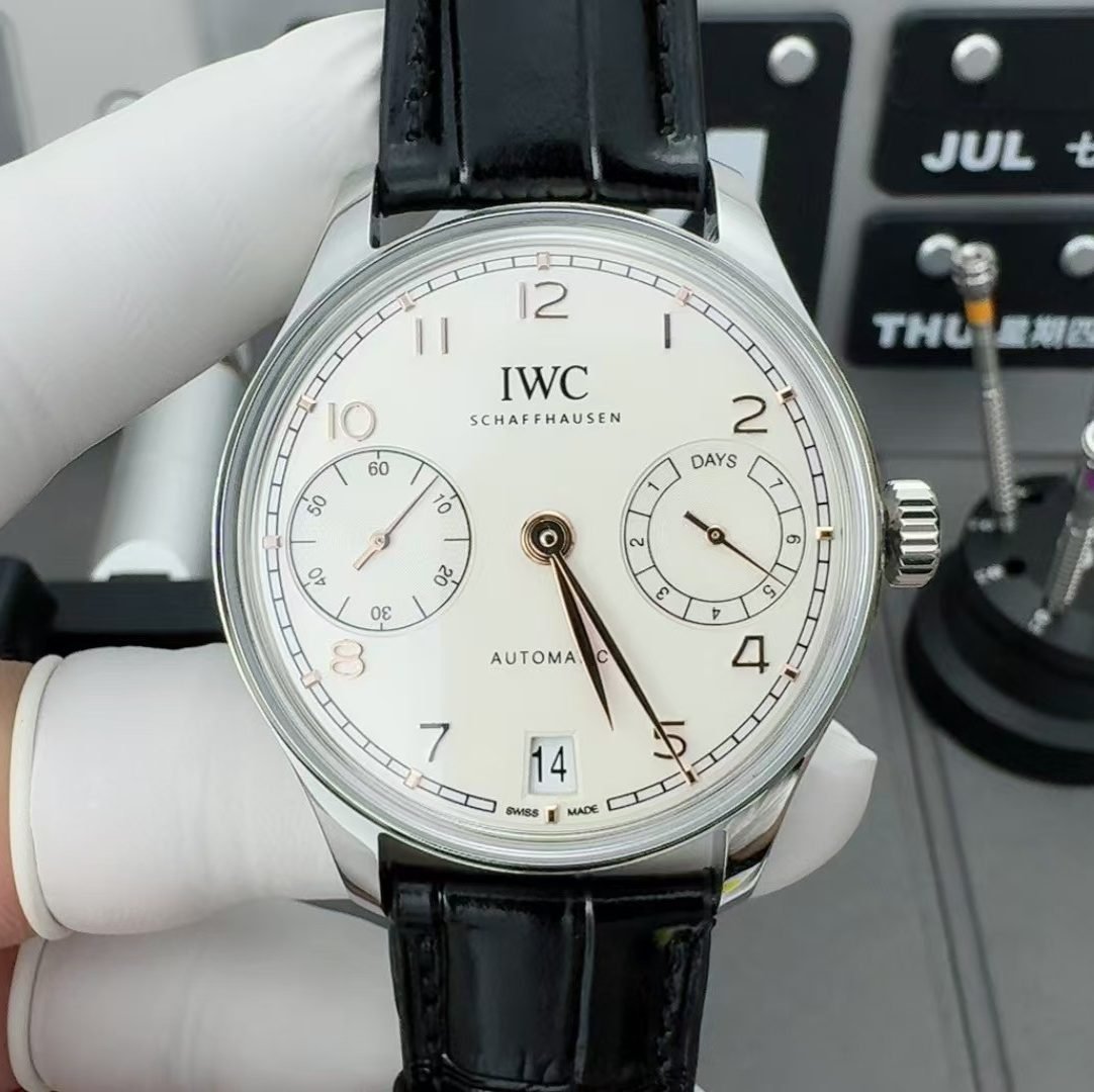The model is correctly identified as IWC Portuguese Automatic IW500701, commonly grouped under the Portuguese 7 Days family. The configuration shown—stainless steel case, white dial, gold-tone leaf hands, black leather strap—is the most neutral and therefore the most revealing version of this watch. That neutrality is why this super clone either works completely or not at all.