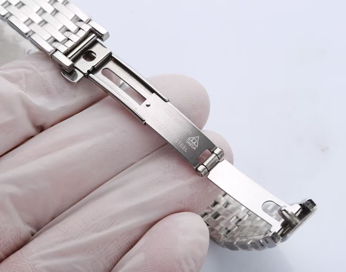 The case and bracelet are crafted from 316L stainless steel, mirror-polished to a fine sheen. The multi-link bracelet feels supple yet substantial on the wrist, with alternating brushed and polished finishes that echo the genuine Omega design. Measuring 32.7mm, this model achieves the perfect balance between femininity and presence, suitable for both daily wear and formal occasions.
