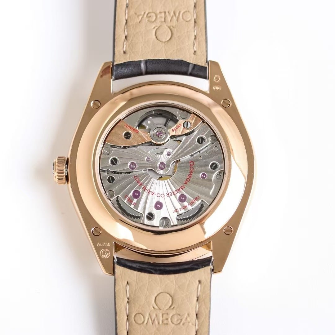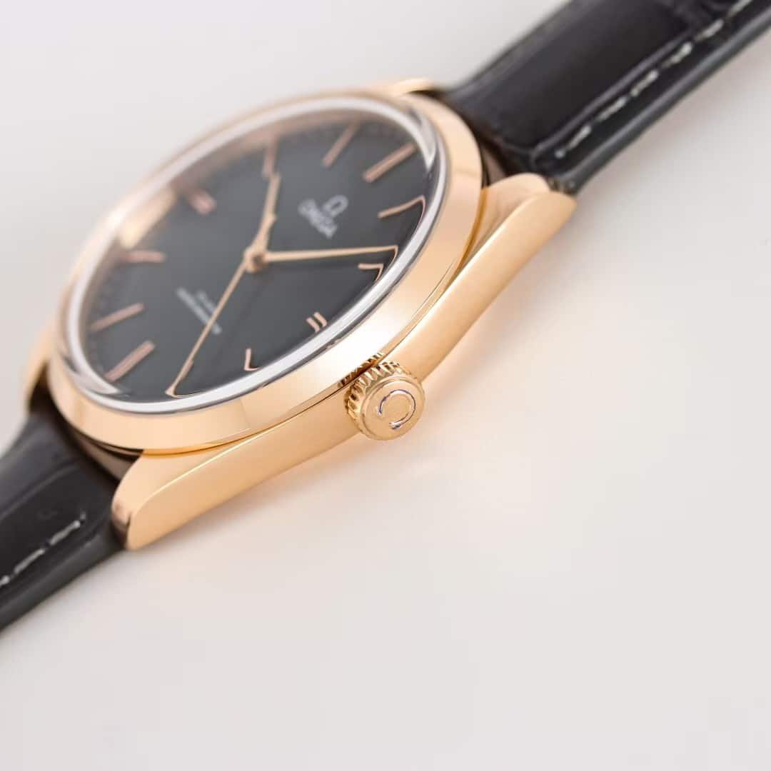The case is made from 316L stainless steel, precisely polished and layered with premium rose-gold PVD coating to mirror Omega’s Sedna gold tone. The craftsmanship is immediately noticeable — the curve of the lugs, the mirror finish, and the way the watch reflects light softly from every angle. Its black domed dial contrasts subtly with rose-gold hands and markers, creating a sense of depth without clutter.