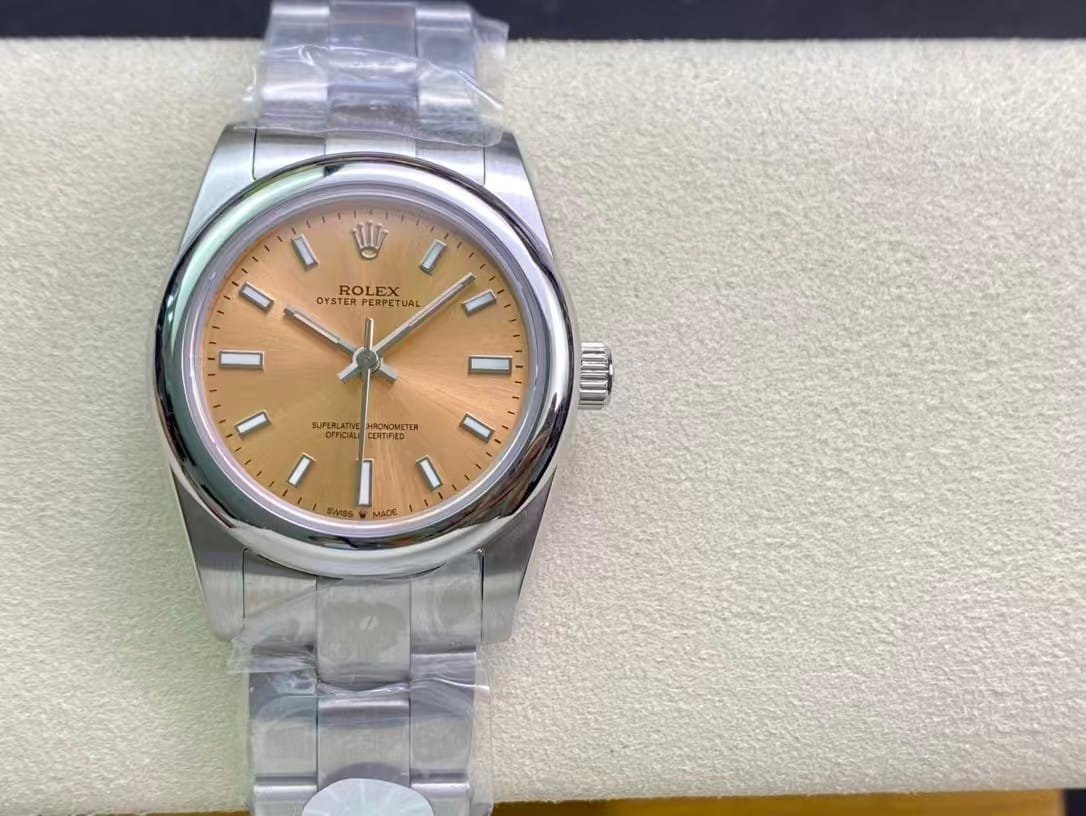 The Champagne Dial Oyster Perpetual is one of those watches that looks simple at first glance, but the longer you look at it, the more deliberate it feels. The color isn’t flashy gold. It’s not metallic yellow. It’s a warm, softened champagne tone that shifts slightly depending on light — sometimes creamy, sometimes gentle bronze, sometimes almost matte.