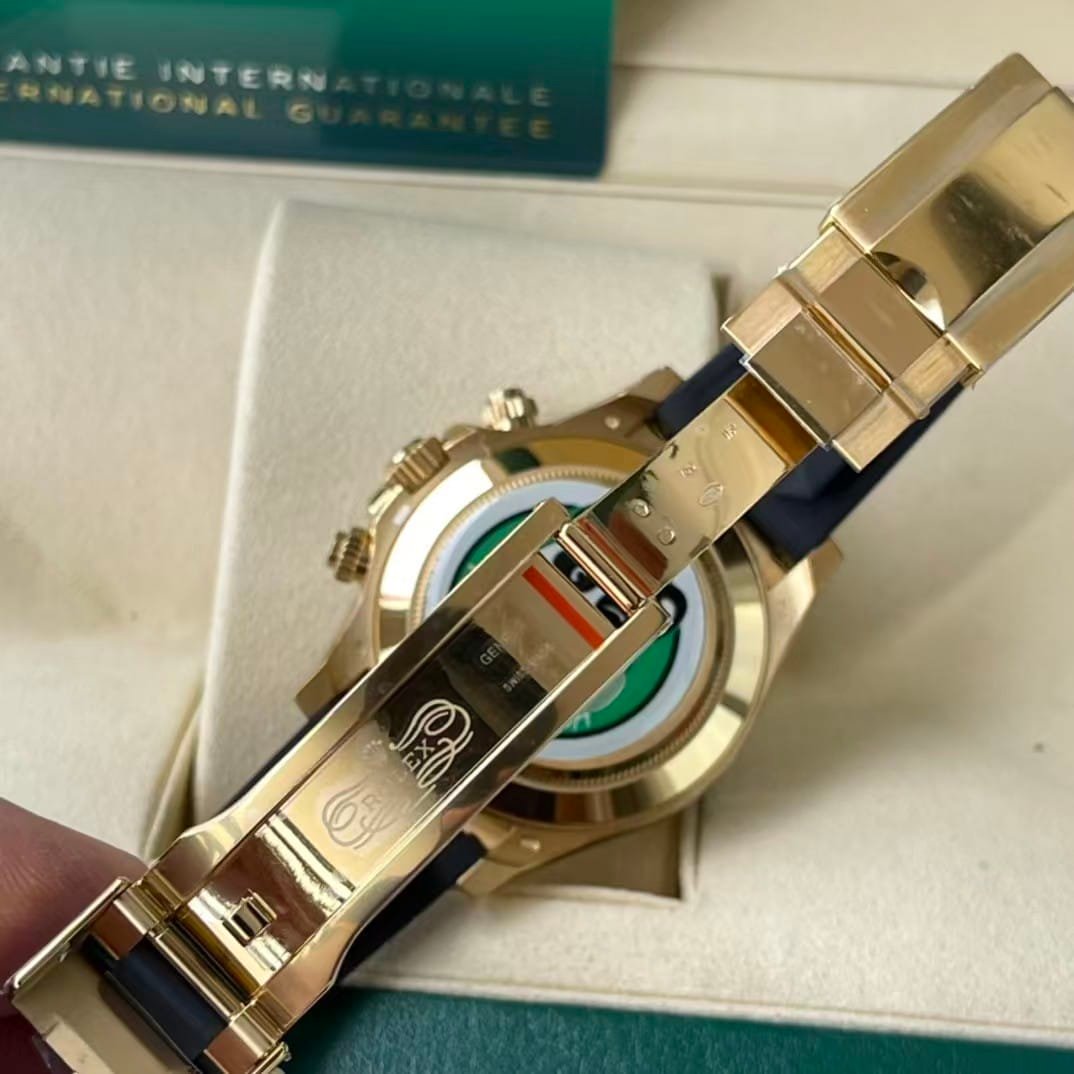 A watch like this looks simple in photos but carries a few real-world risks. The gold tone can shift slightly depending on ambient light. Rubber-style straps fit differently from metal bracelets, and some wrists need a longer piece. And like any super clone, the movement is not a true Rolex caliber, even when the layout tries to mirror a 4130.