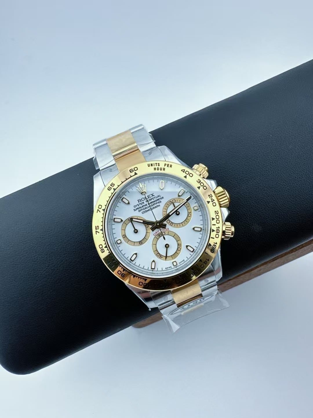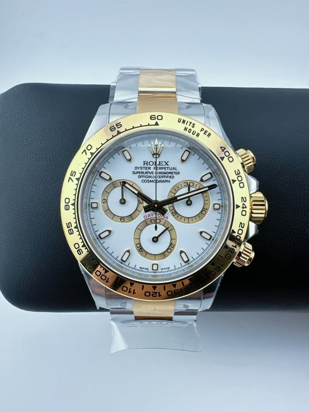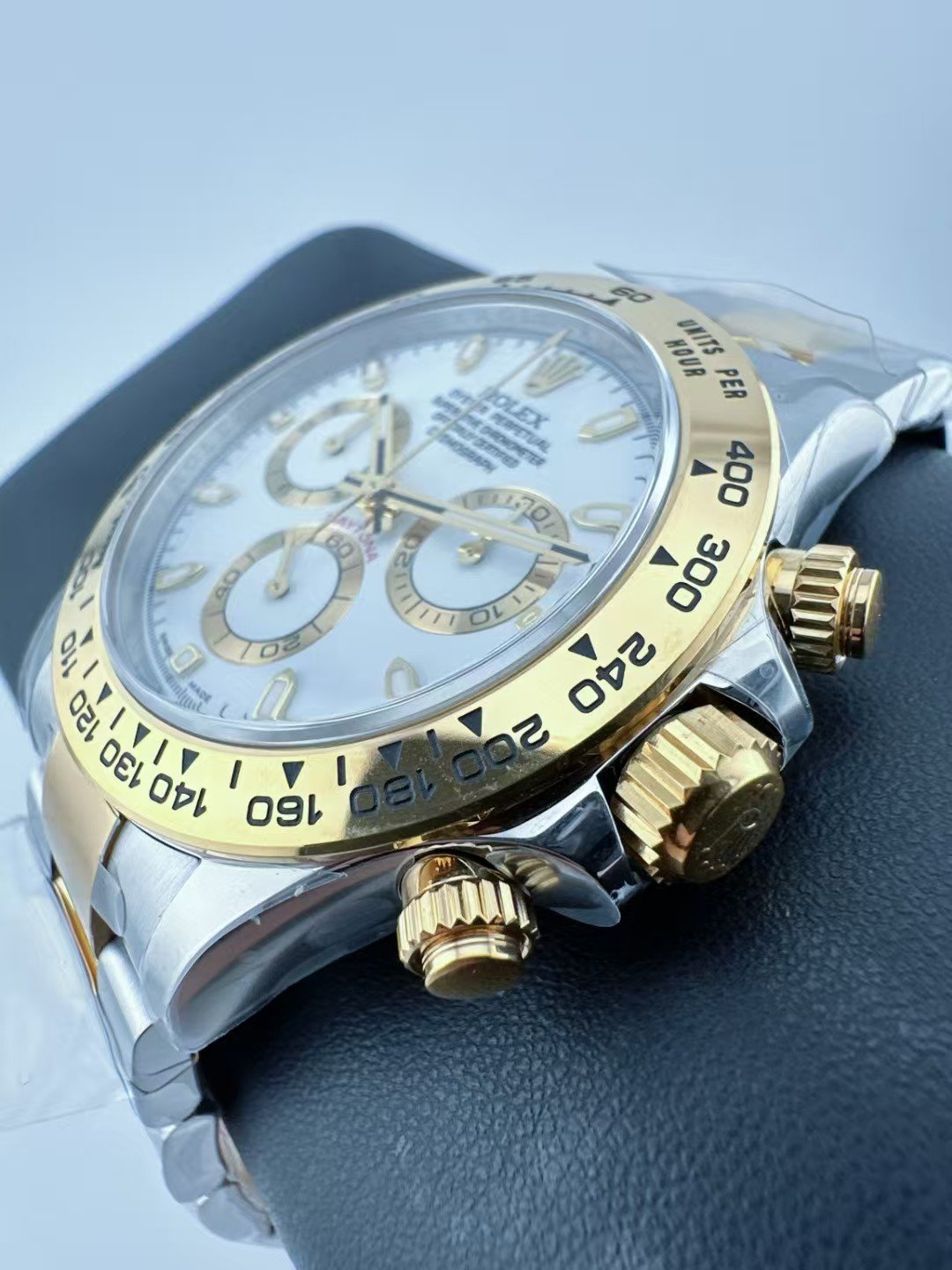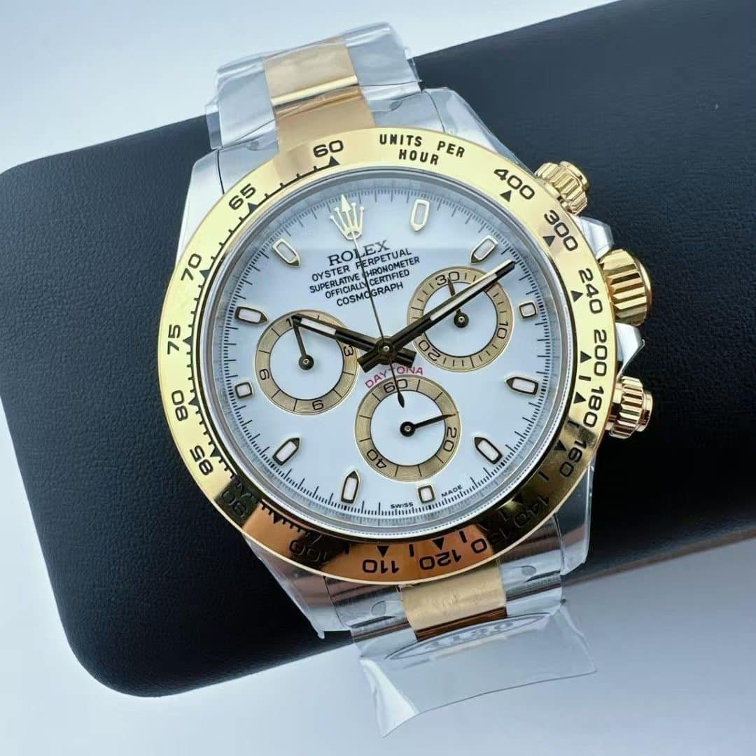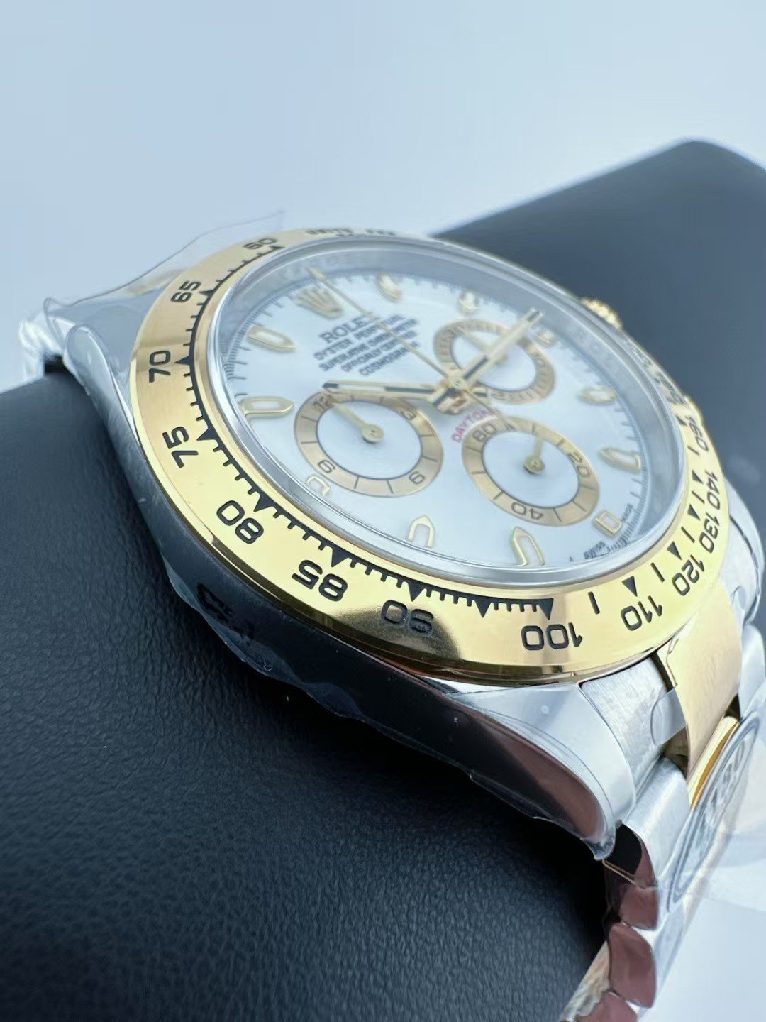 White-dial Daytonas work differently from darker models. The dial stays clean and open, so the gold-tone details catch light in a softer way. This two-tone layout feels familiar the moment you pick it up. The polished center links reflect more light than the steel sides, but the white dial keeps everything balanced. On the wrist, the watch feels tighter and more structured than the photos suggest.