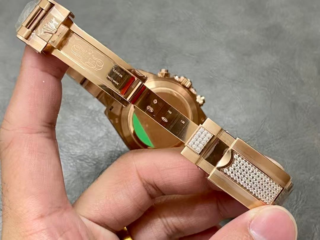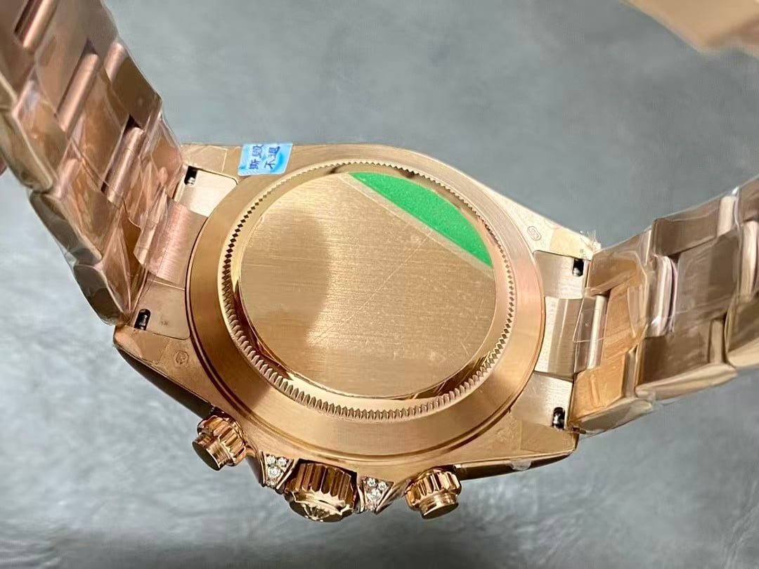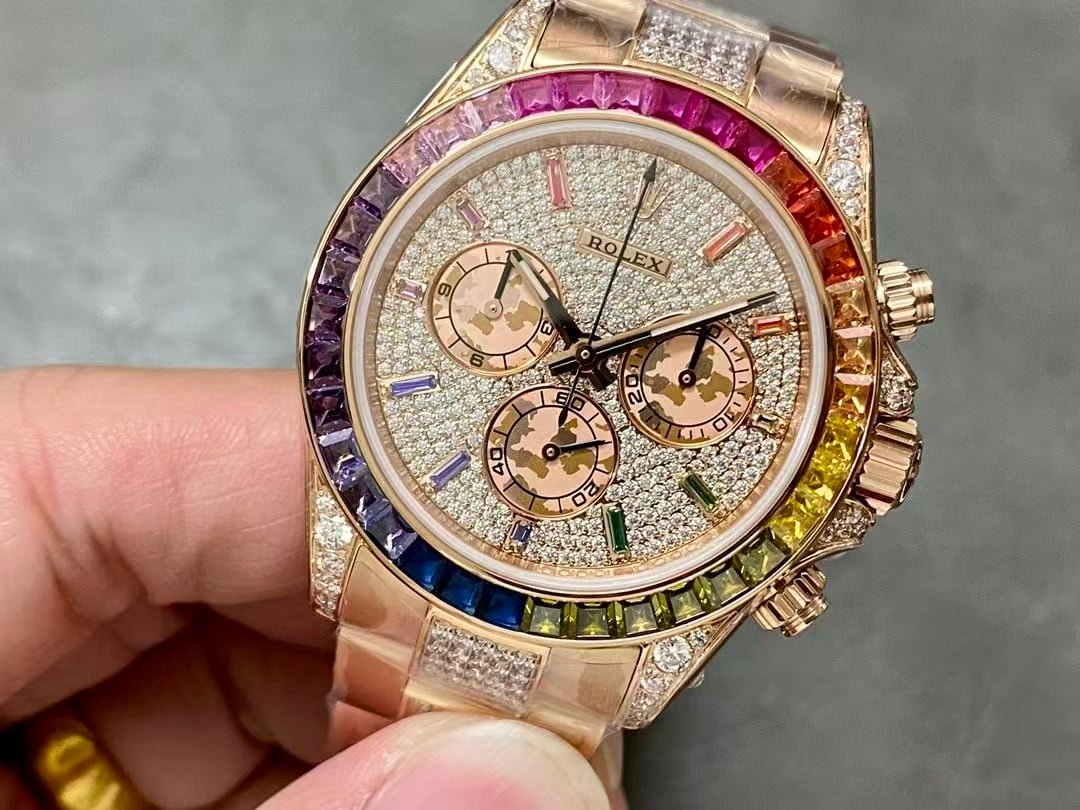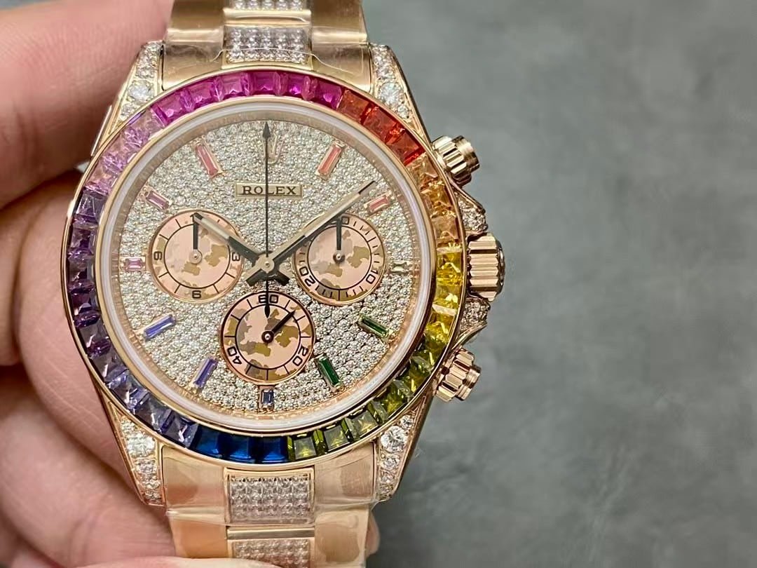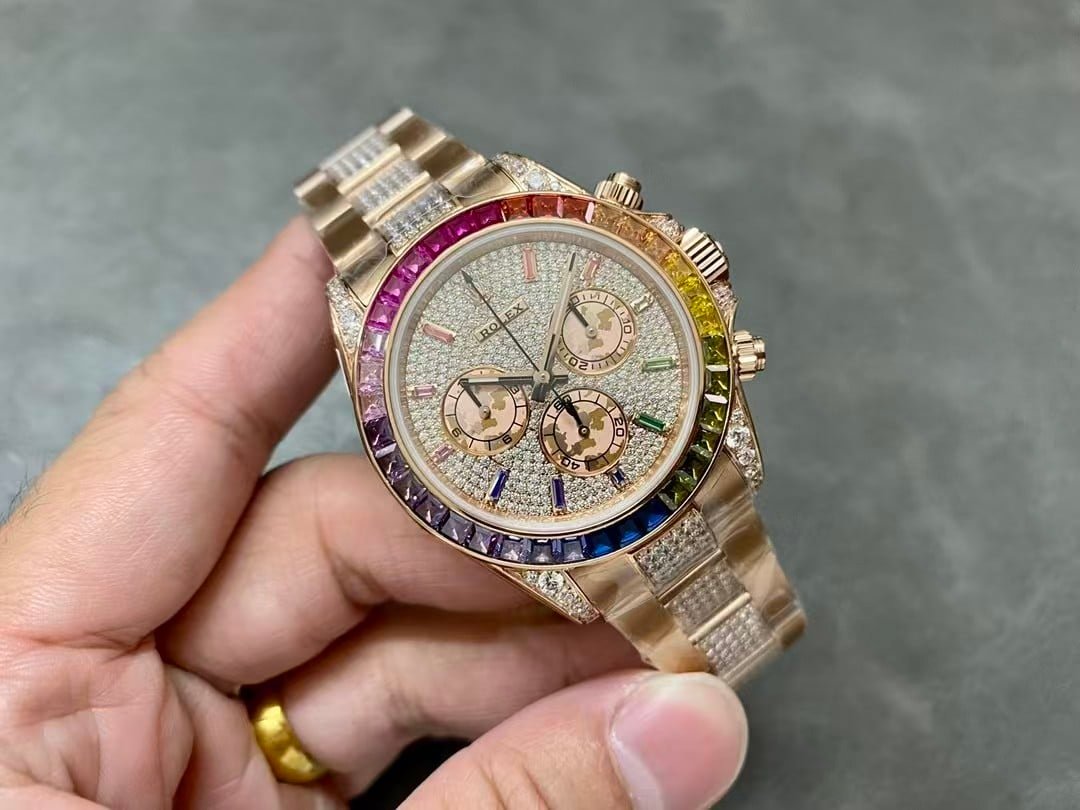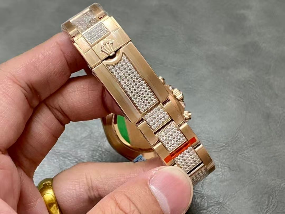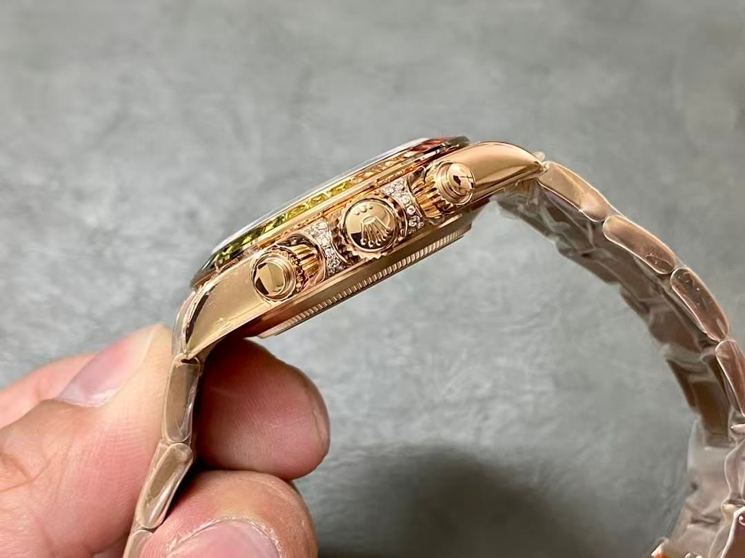 A rainbow Daytona super clone carries small realities that most people don’t mention. The bezel colors may shift slightly depending on indoor bulbs. The pavé dial can look busier in harsh light and softer in natural light. The movement is reliable for daily use, but it isn’t shock-proof like a genuine Rolex 4130. And this much surface detail makes scratches more visible, especially on the polished rose-tone parts.