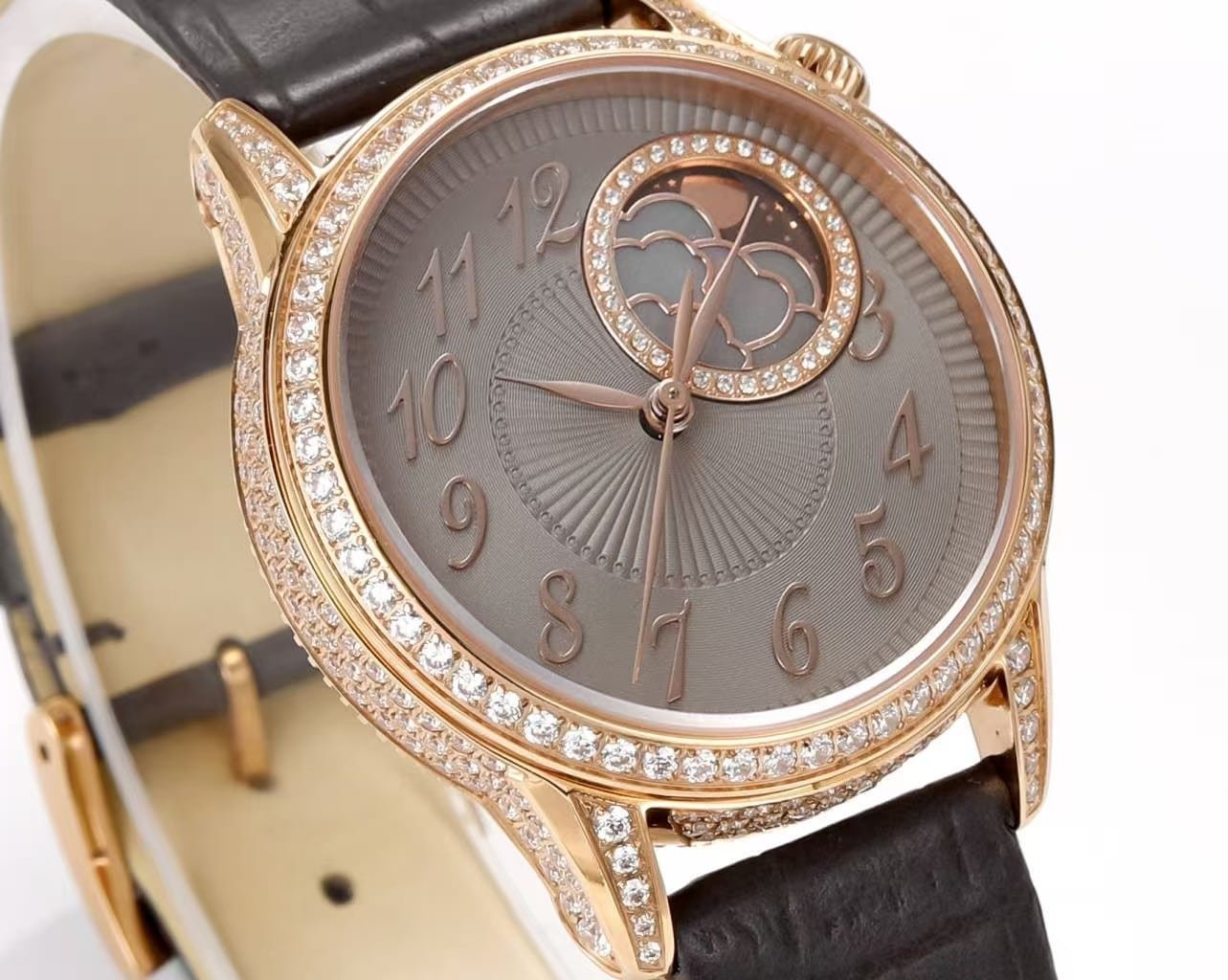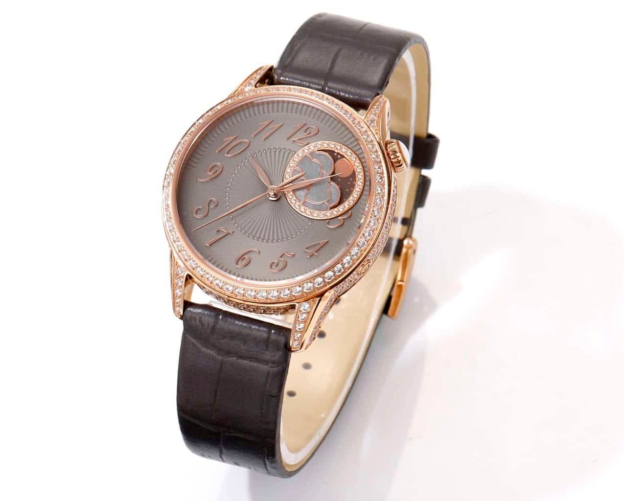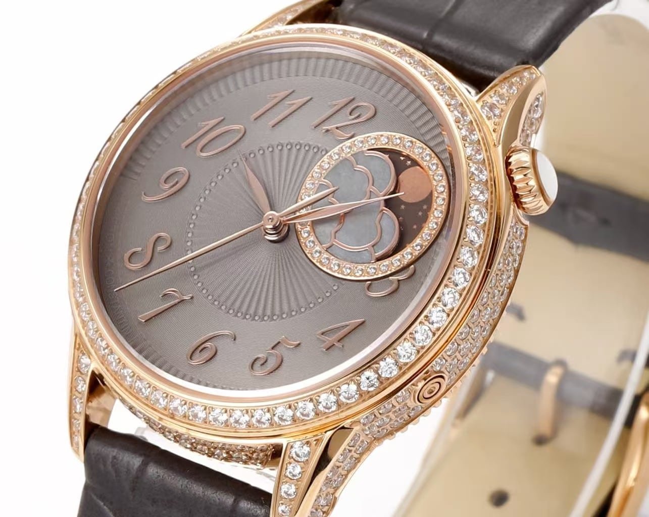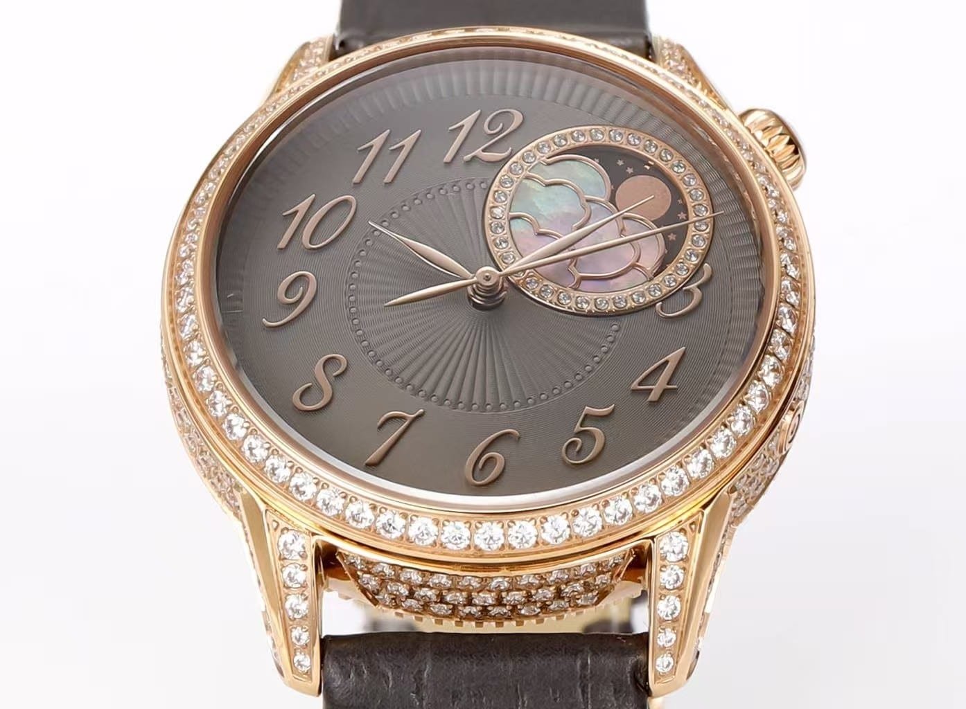 Time reading happens in stages. The eye is drawn first to the off-centered moonphase display at 2 o’clock, framed in rose gold and set with diamonds. The cloud motif, carved from mother-of-pearl, contrasts clearly against the darker dial, especially under indoor lighting.