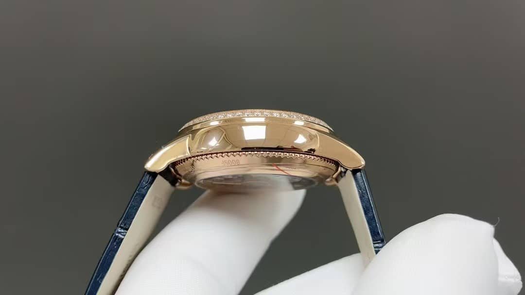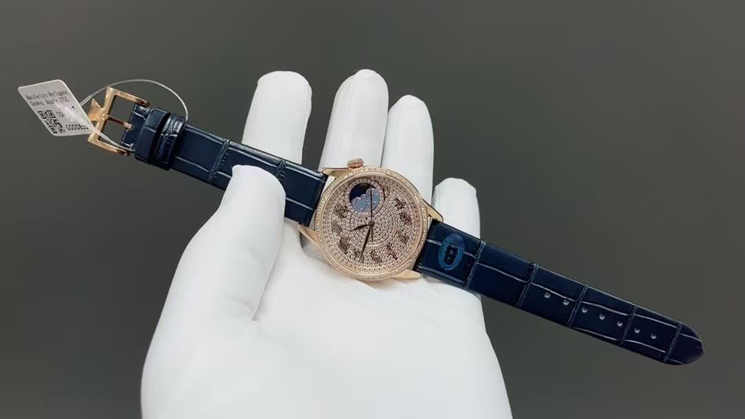 The rose gold–tone case, full pavé diamond dial, and moonphase aperture at 2 o’clock immediately place this China replica in a specific category. This is not a background dress watch. It interacts with light constantly, and that interaction shapes how it feels to live with.
